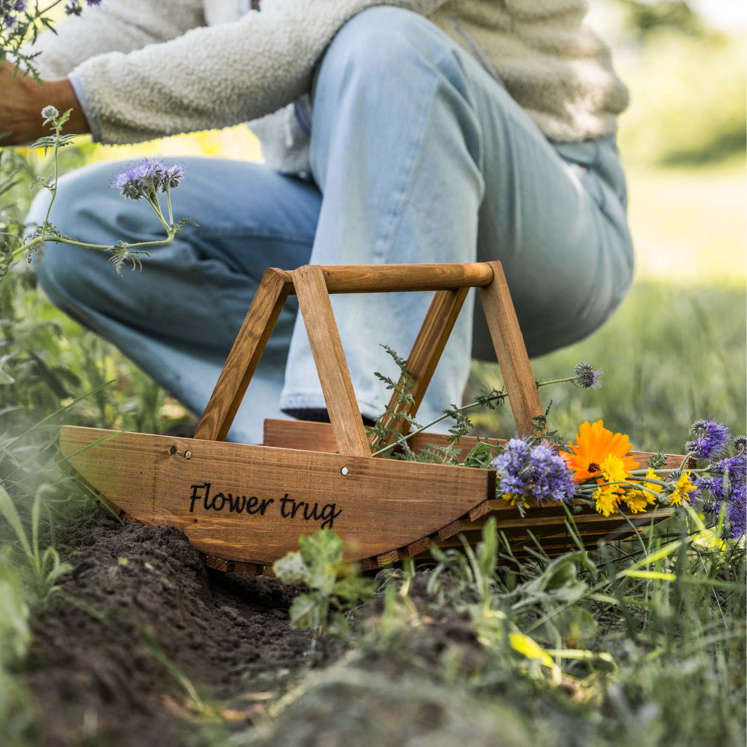 Deze houten bloemennmand is een veelzijdige oogstmand. Ideaal voor het verzamelen van bloemen, kruiden, bessen of andere lichte oogst. De mand is vervaardigd uit vurenhout, wat zorgt voor een natuurlijke uitstraling en duurzame constructie. Dankzij de grote inhoud kun je er ook een flike bos in kwijt.