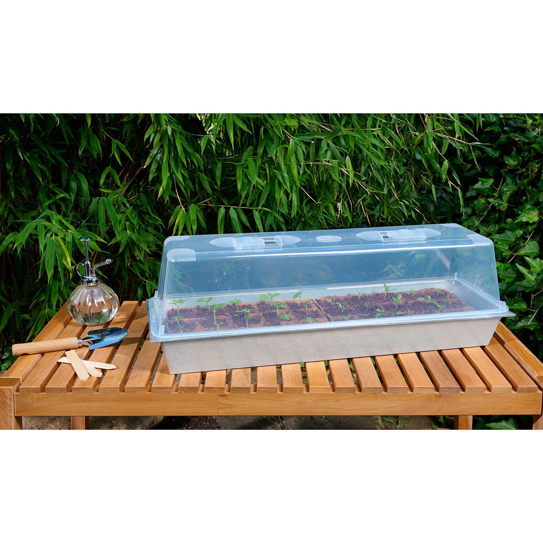 Vul de potjes met aarde of kokos‑substraat, zaai zaden of zet stekjes erin en plaats de kap erop. Het kasje creëert een warm en vochtig microklimaat, terwijl de ventilatie zorgt voor frisse lucht, waardoor zaden beter kiemen en jonge planten stabiel groeien.