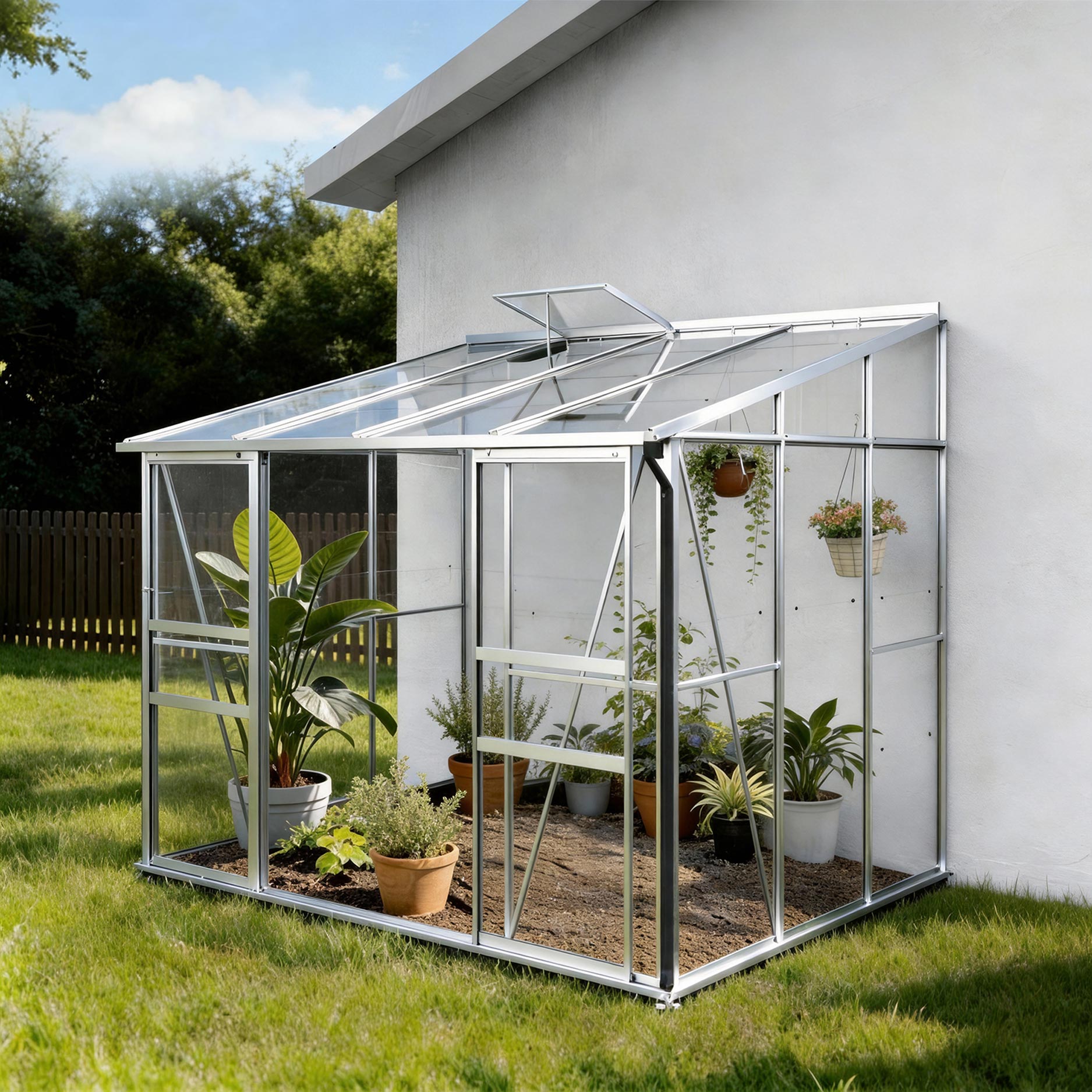 De aluminiumconstructie met veiligheidsglas zorgt voor stabiliteit en lichtinval. De schuifdeur en het dakvenster houden het binnenklimaat aangenaam, terwijl de hemelwaterafvoer regenwater efficiënt afvoert. Dankzij het funderingsframe blijft de kas stevig staan, ook bij wind of regen.