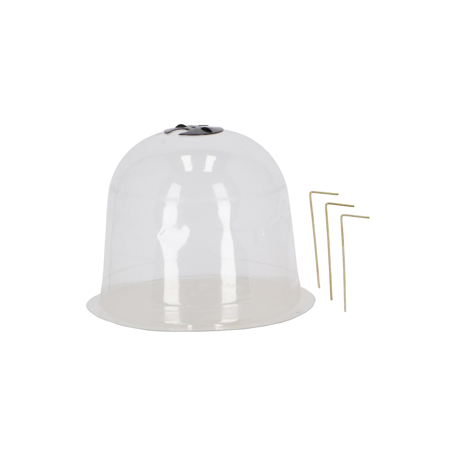 Gebruik de stolp door hem over je zaailing of jonge plant te zetten en de rand licht in de aarde te drukken. Zet hem vervolgens vast met de meegeleverde pinnen, zodat hij ook bij wind goed blijft staan. Met de draaidop bovenop bepaal je zelf hoeveel ventilatie er is: meer open op zonnige dagen om oververhitting te voorkomen, en meer dicht bij kou of harde wind om warmte vast te houden. Zo creëer je een stabieler microklimaat waarin planten sneller en veiliger kunnen groeien.