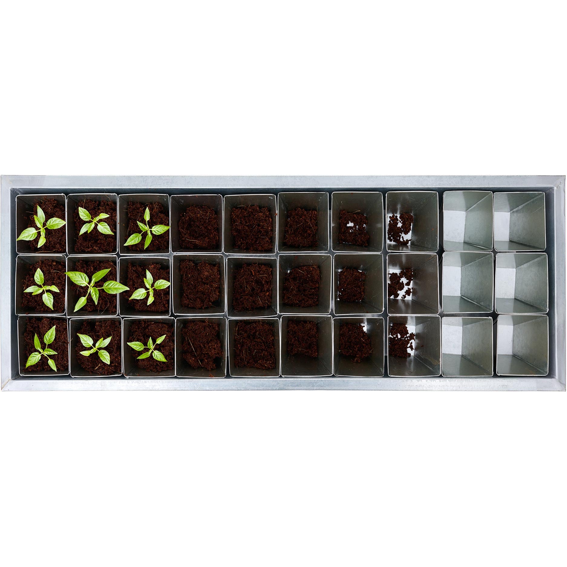 De Zaaitray Metaal Potten Blank is een set van een blank kleurige onderschaal met 30 gekleurde potten is een stevige, roestbestendige zaaibak met dertig metalen potjes, ideaal om zaden van groenten, kruiden of bloemen voor te kiemen. De potten zijn herbruikbaar en duurzaam.