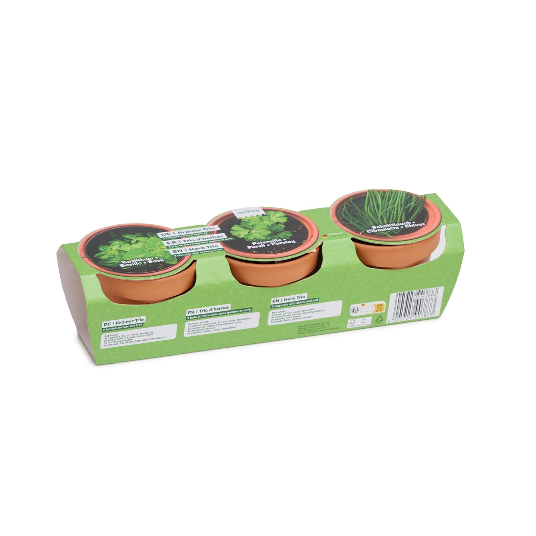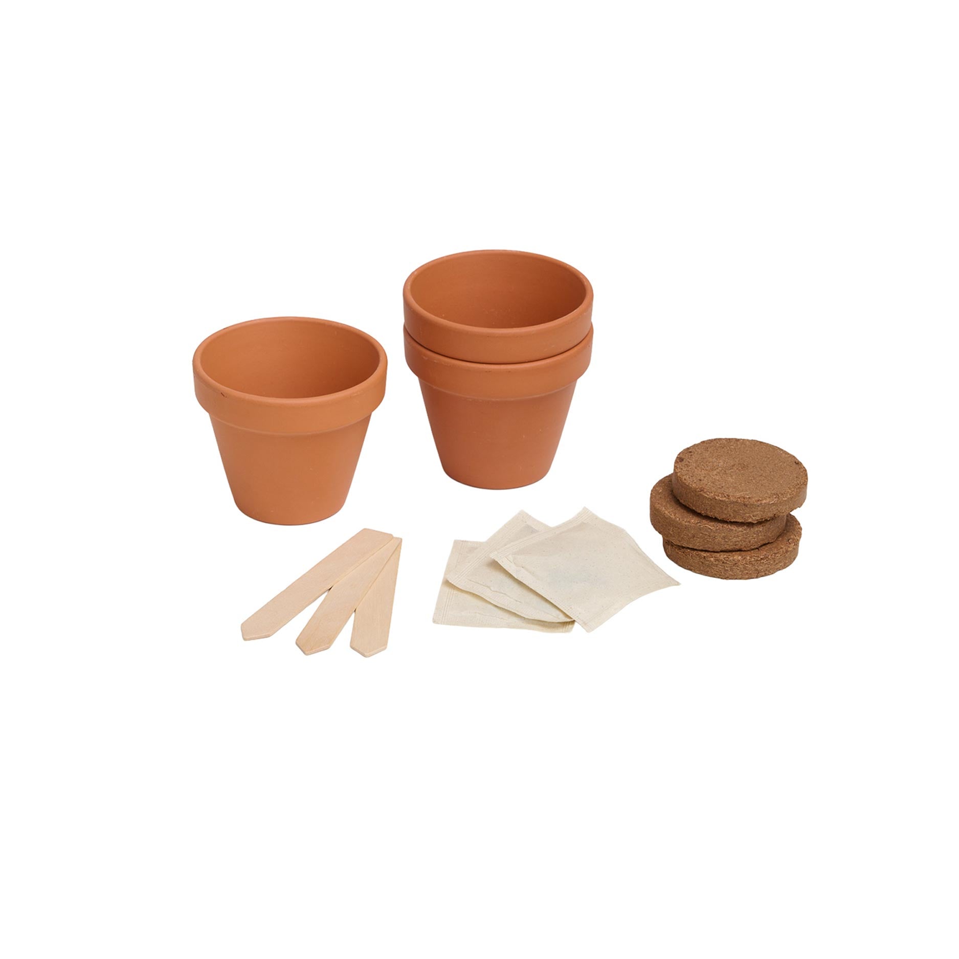 De Kweekset Kruidentrio is een set van drie kleine terracotta potjes, ideaal om basilicum, peterselie en bieslook zelf te kweken. De potjes zijn gemaakt van natuurlijke klei en geschikt voor op de vensterbank, in de keuken of op het balkon. De set bevat ook kokos-substraat en houten etiketten om de kruiden te herkennen.
