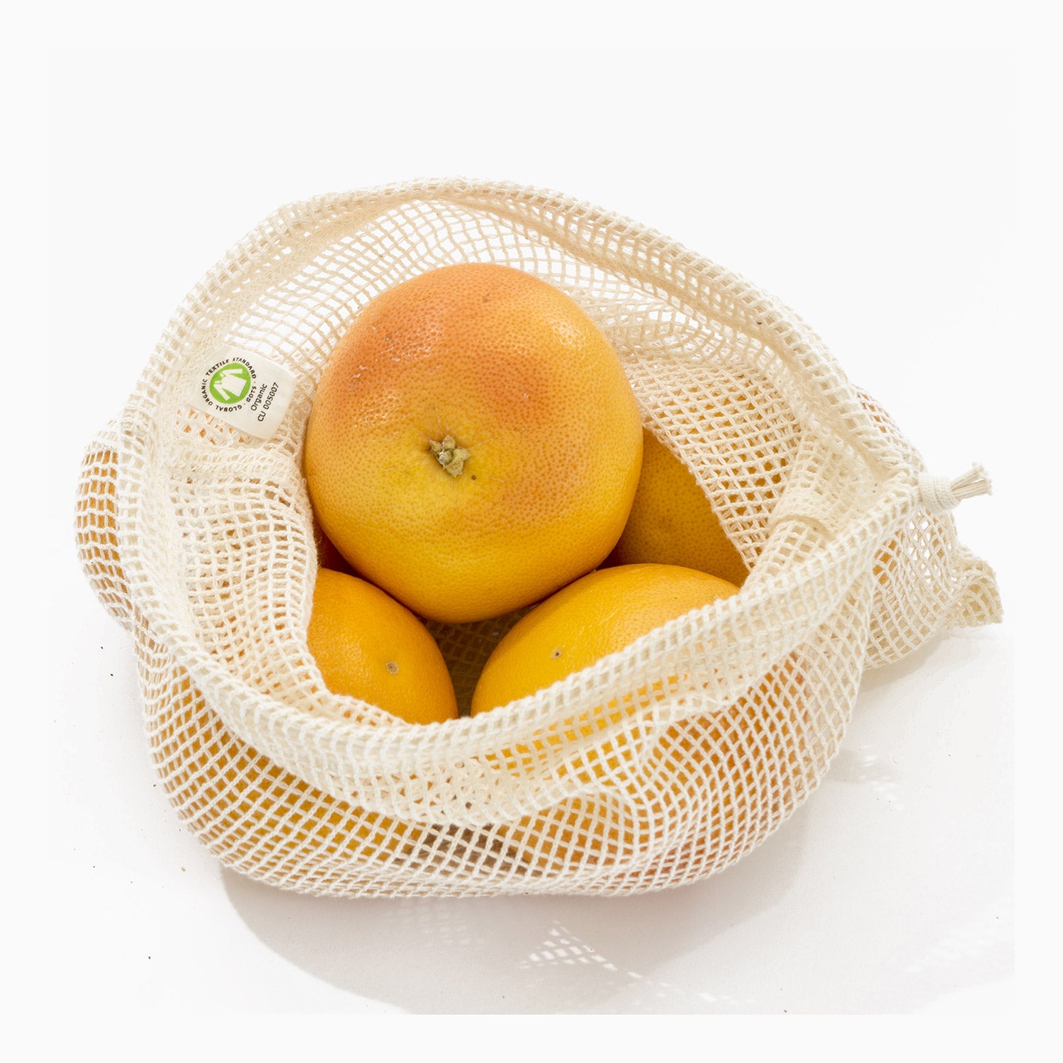 Deze groente- of fruitzakjes zijn van 100% gecertificeerde biokatoenen netstof en gemaakt in India. Wasbaar op een lage temperatuur en voorzien van een label.