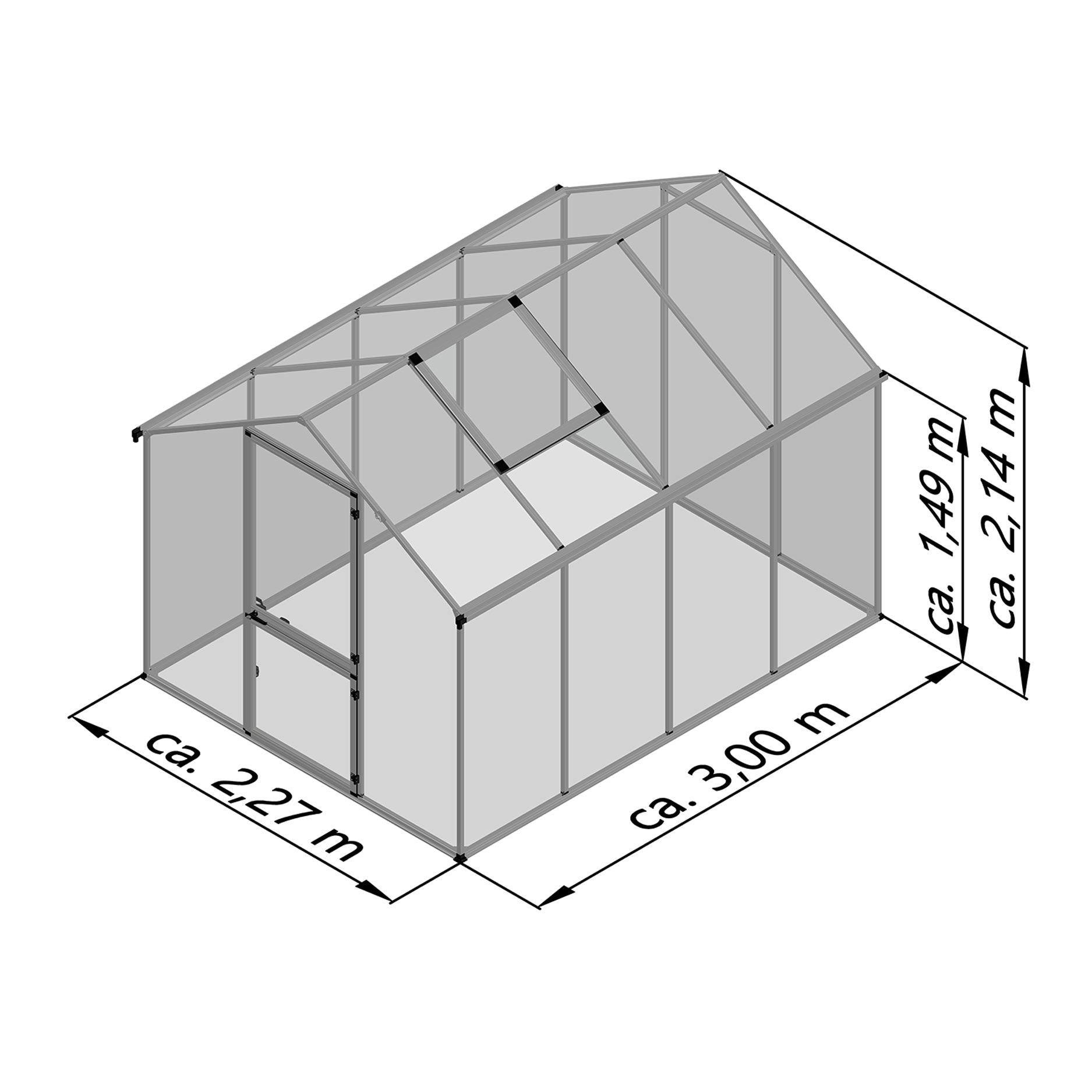 De constructie bestaat uit een sterk frame van aluminium, dat de kas licht van gewicht houdt maar toch uitzonderlijk stabiel maakt. De 6 mm kanaalplaten zijn isolerend en UV-beschermd, waardoor het binnenklimaat langer constant blijft. Dit maakt de kas geschikt voor gebruik in zowel het vroege voorjaar als de nazomer. De grote draaideur vergemakkelijkt de toegang, zelfs met gereedschap of bakken, terwijl het ruime dakraam voor gecontroleerde ventilatie zorgt. De geïntegreerde regengoten voeren neerslag netjes af en maken hergebruik van regenwater eenvoudig. Met het optionele funderingsframe creëert de tuinierder een solide basis voor jarenlang onderhoudsarm gebruik.