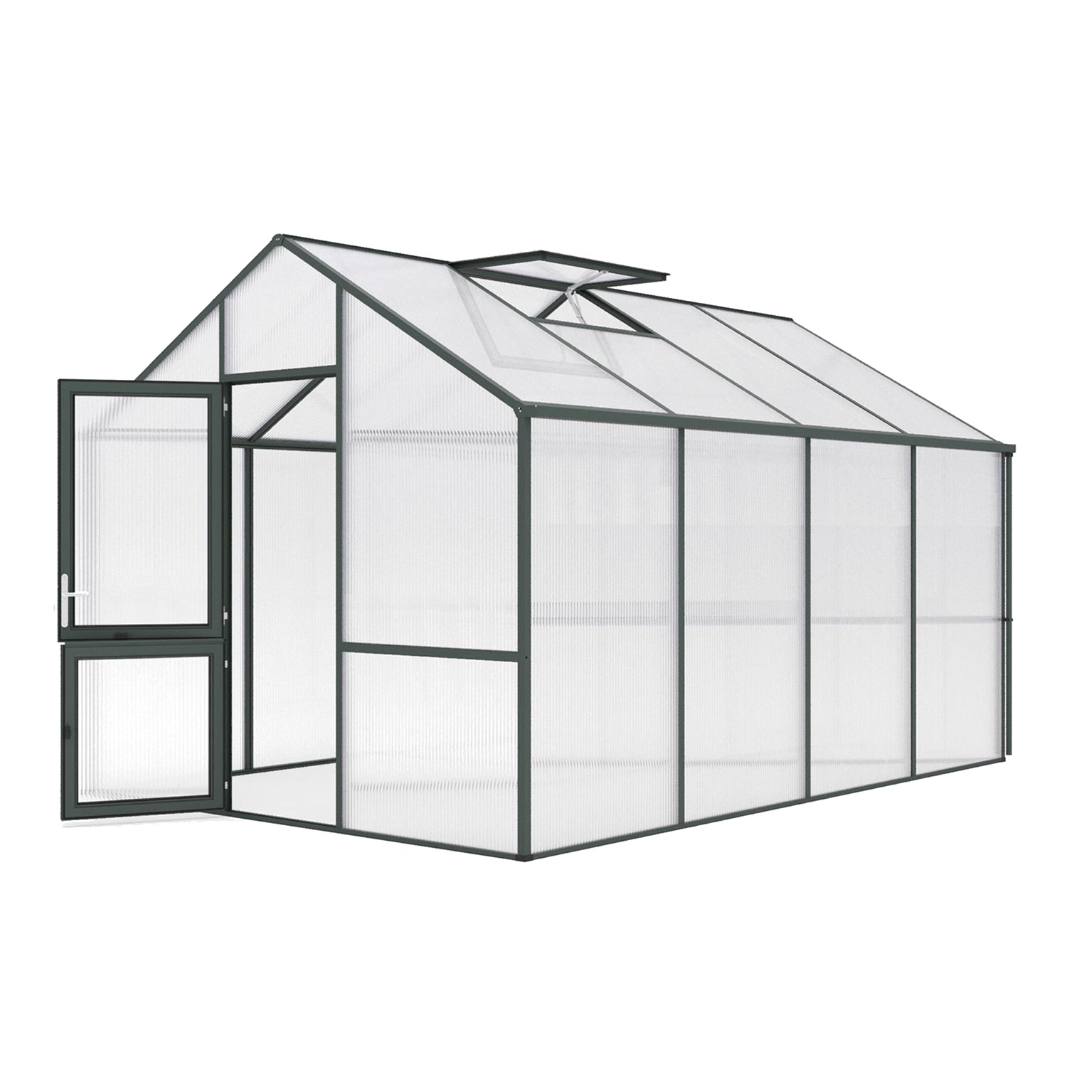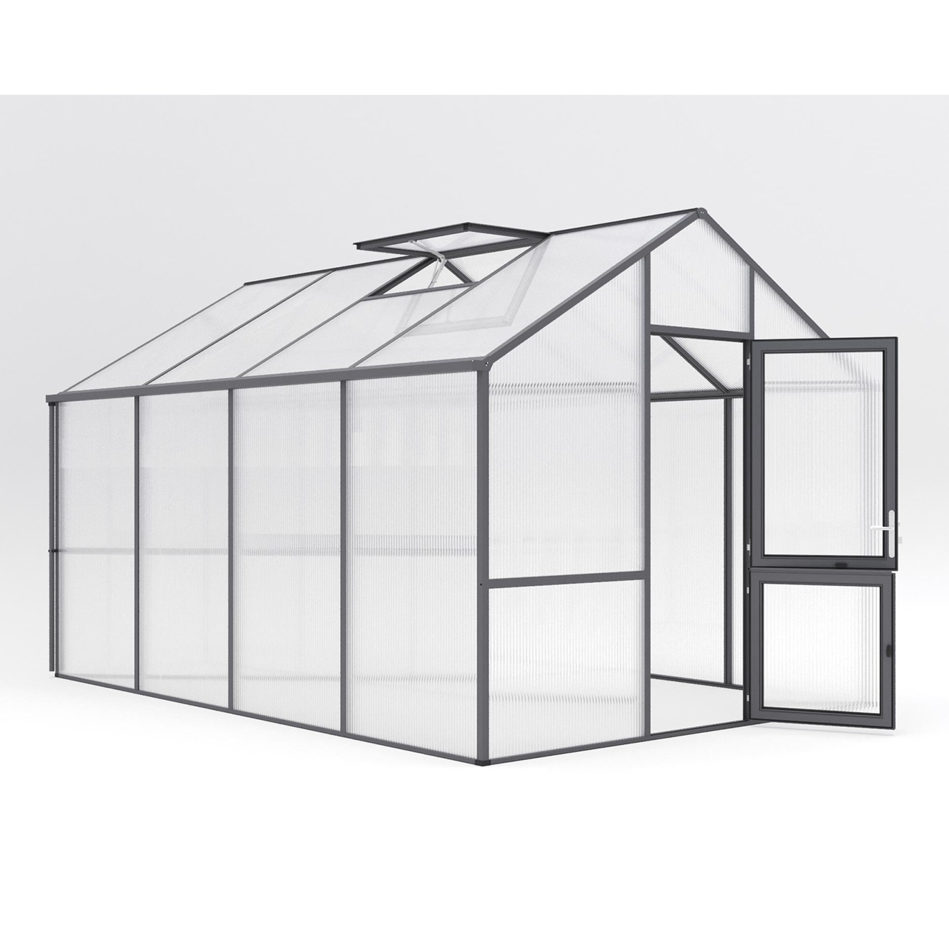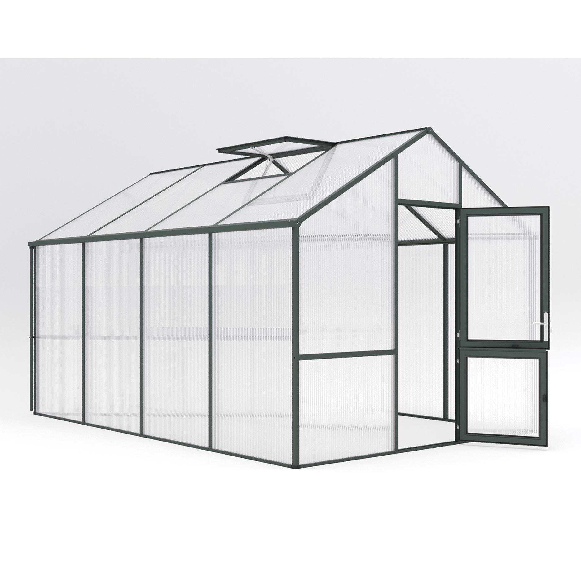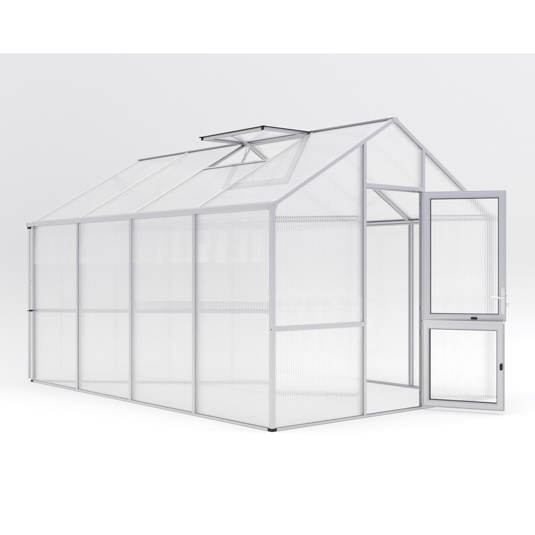 De 16mm kanaalplaten bieden de hoogste isolatiewaarde binnen het KGT-assortiment en verdelen het licht gelijkmatig over de hele kas. De aluminiumconstructie is robuust, onderhoudsarm en bestand tegen langdurige belasting. De Dahlie IV beschikt over een brede draaideur, twee dakramen (waarvan één automatisch), een handmatig achterraam en dubbele regengoten. De combinatie van uitstekende isolatie en uitgebreide ventilatiemogelijkheden zorgt voor een constant, gezond kweekklimaat. Met het optionele funderingsframe staat de kas rotsvast en waterpas.