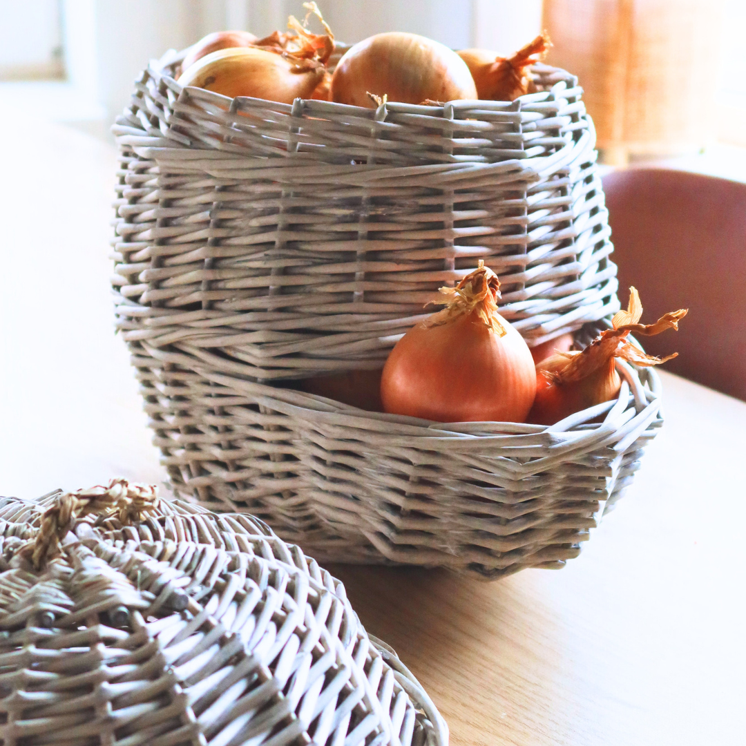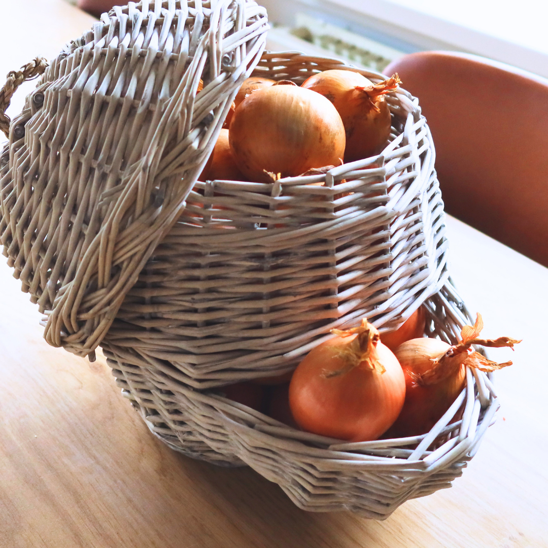 Met deze authentieke en decoratieve mand kunnen uien ideaal in de keuken, berging of kelder worden bewaard met weinig kans op uitlopers. Dankzij de open structuur wordt de oogst goed geventileerd en blijft het voor langere tijd vers. Door de uitstekende opening komt altijd de oudste voorraad als eerste uit de mand. De verse oogst dient men boven in de mand te plaatsen door het afnemen van de deksel. Naast uien, kunnen in deze mand bijvoorbeeld ook appels en aardappelen bewaard worden.