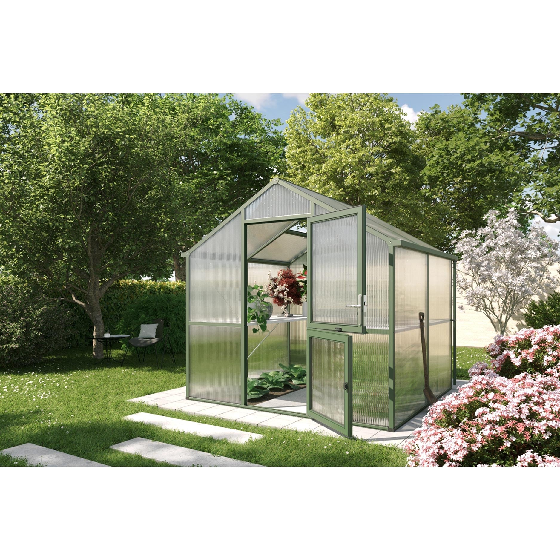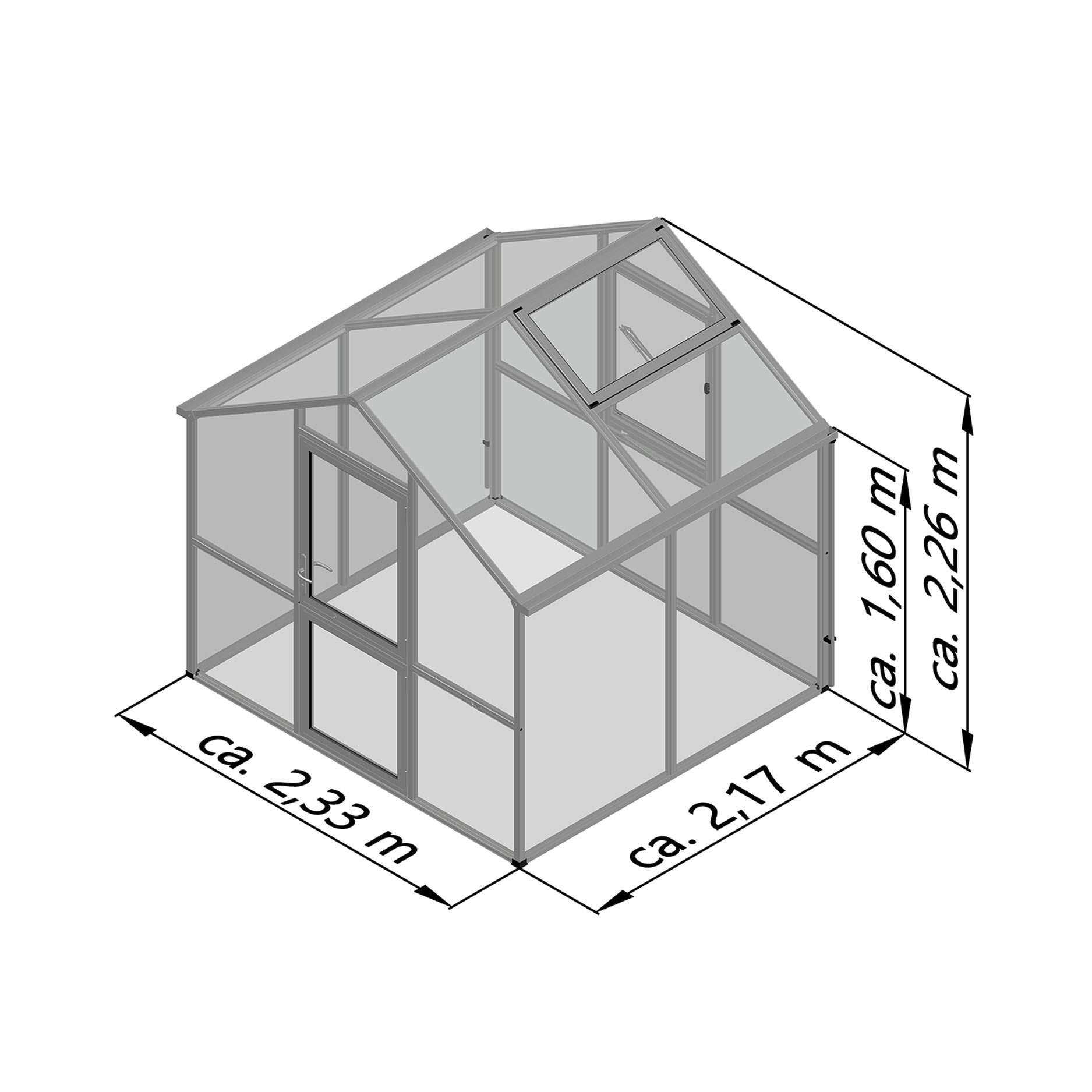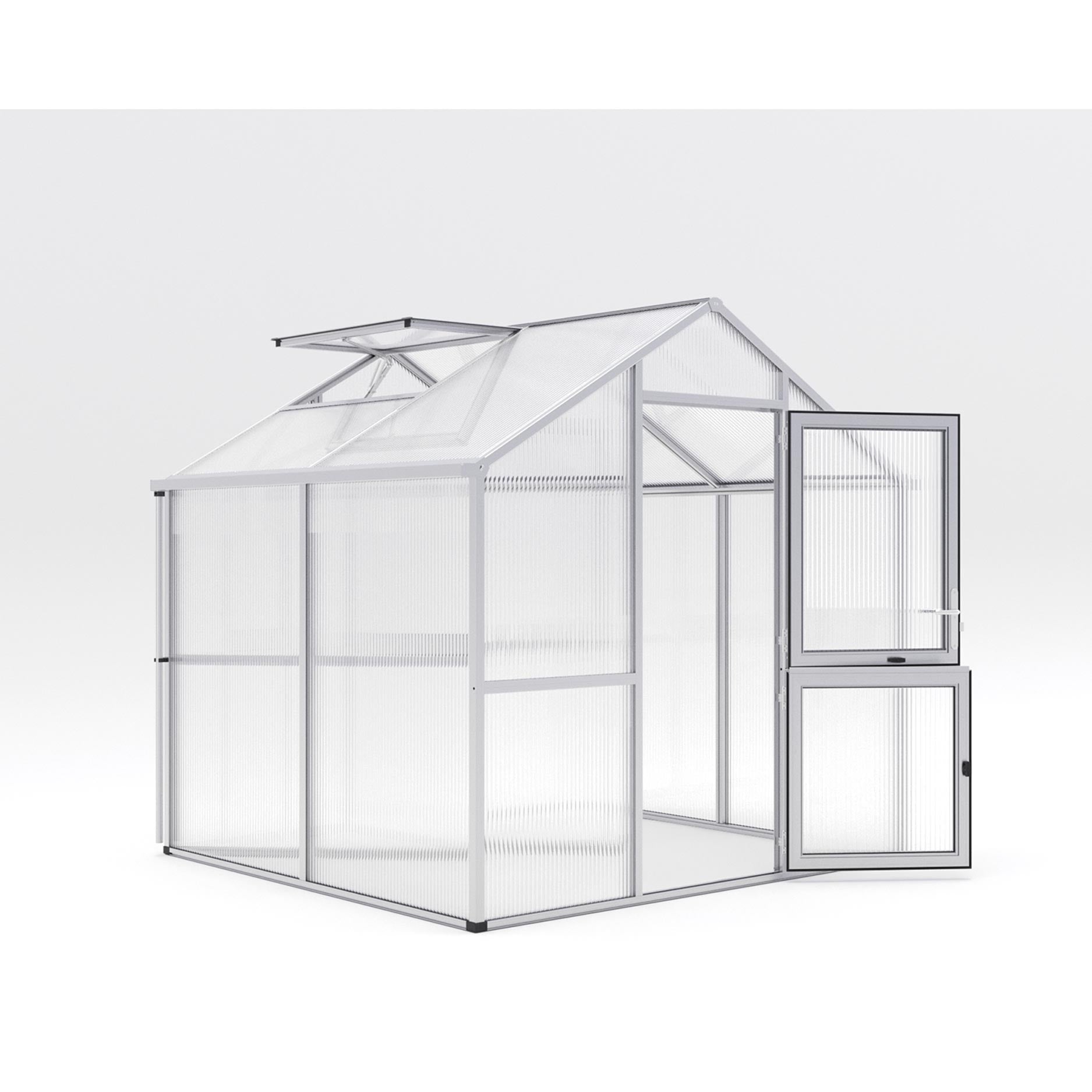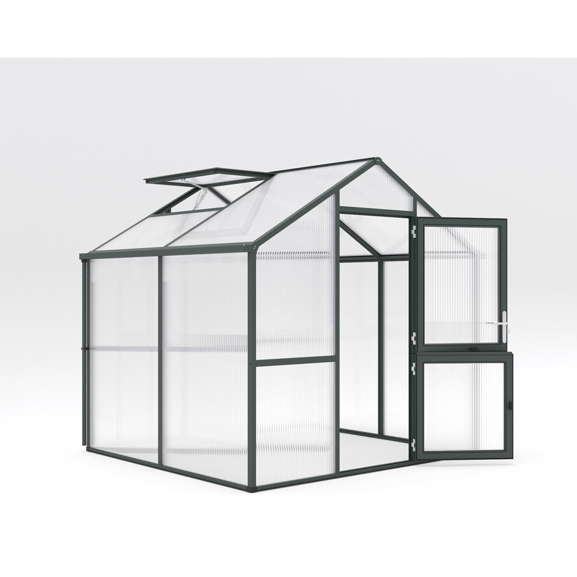 De constructie bestaat uit een robuust aluminium frame met 16mm kanaalplaten die zorgen voor maximale isolatie en lichtverspreiding. Dit materiaal houdt warmte vast, voorkomt condens en beschermt planten tegen UV-straling. De kas is voorzien van een brede draaideur, een automatisch dakraam en geïntegreerde regengoten aan beide zijden. Met het optionele funderingsframe staat de kas stevig en waterpas, ook bij harde wind of ongelijke ondergrond.