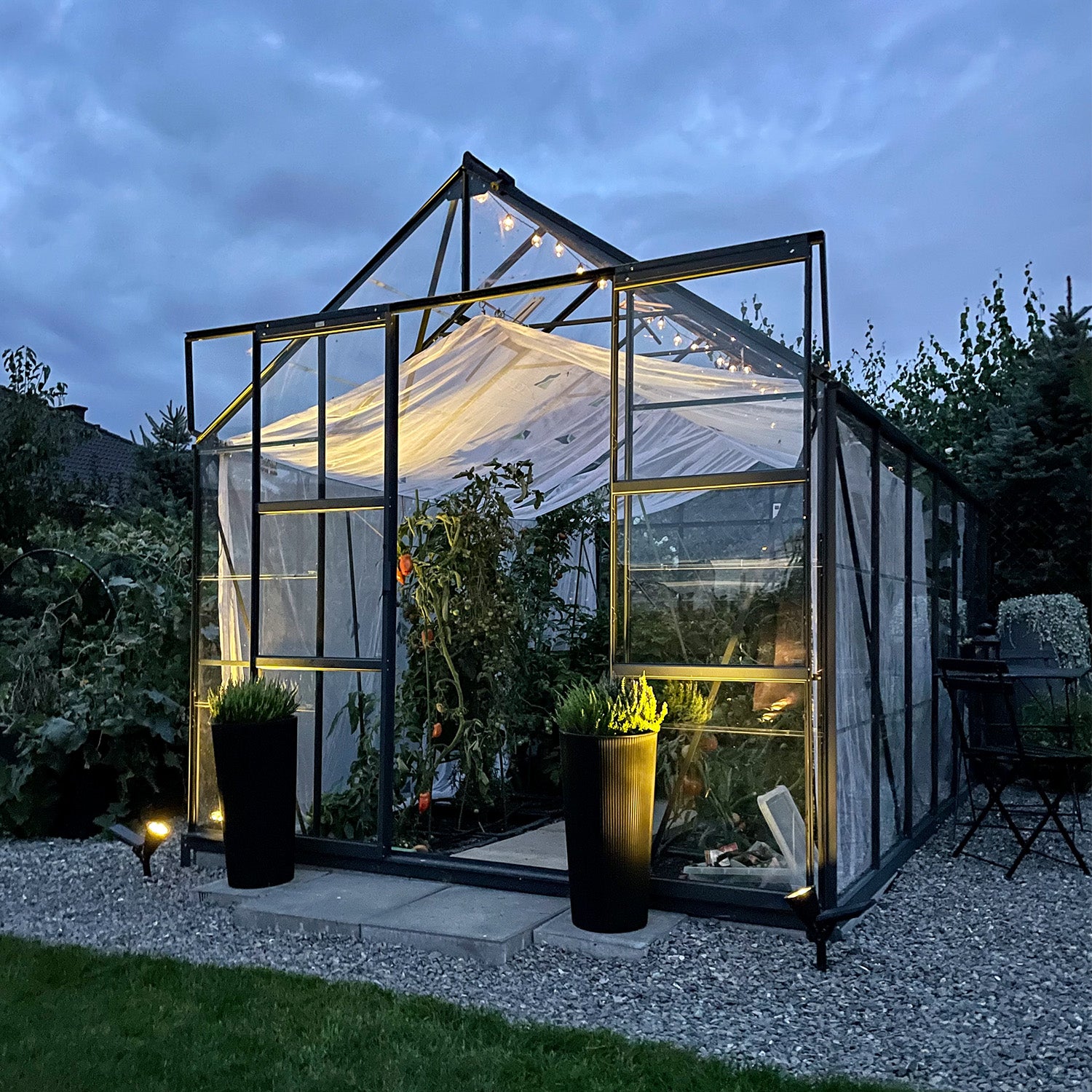 De aluminiumconstructie met veiligheidsglas zorgt voor een stabiele en duurzame basis. De dubbele schuifdeur loopt soepel en laat veel licht binnen, terwijl de dakvensters het binnenklimaat op warme dagen aangenaam houden. De geïntegreerde hemelwaterafvoer maakt wateropvang eenvoudig, en het funderingsframe garandeert een stevige plaatsing op elke ondergrond.