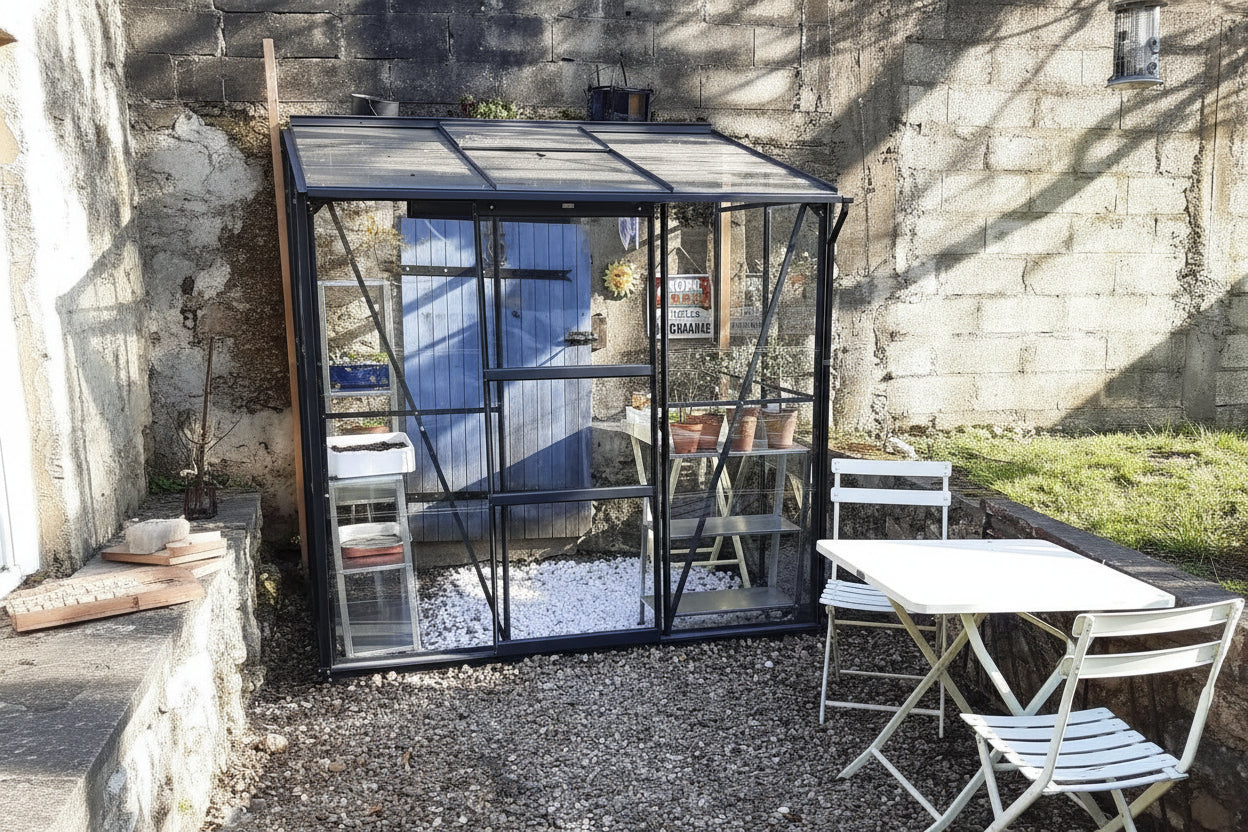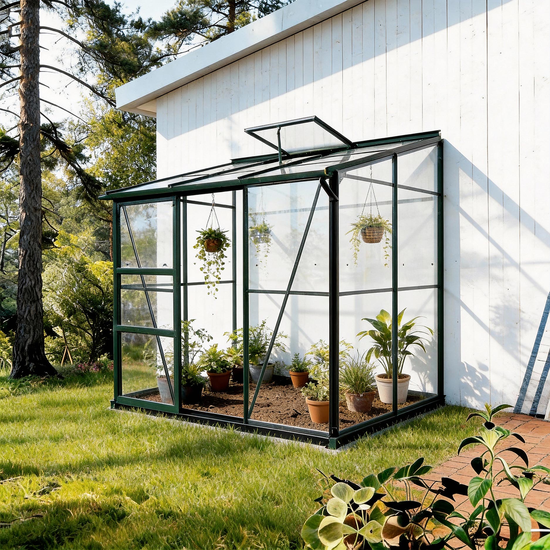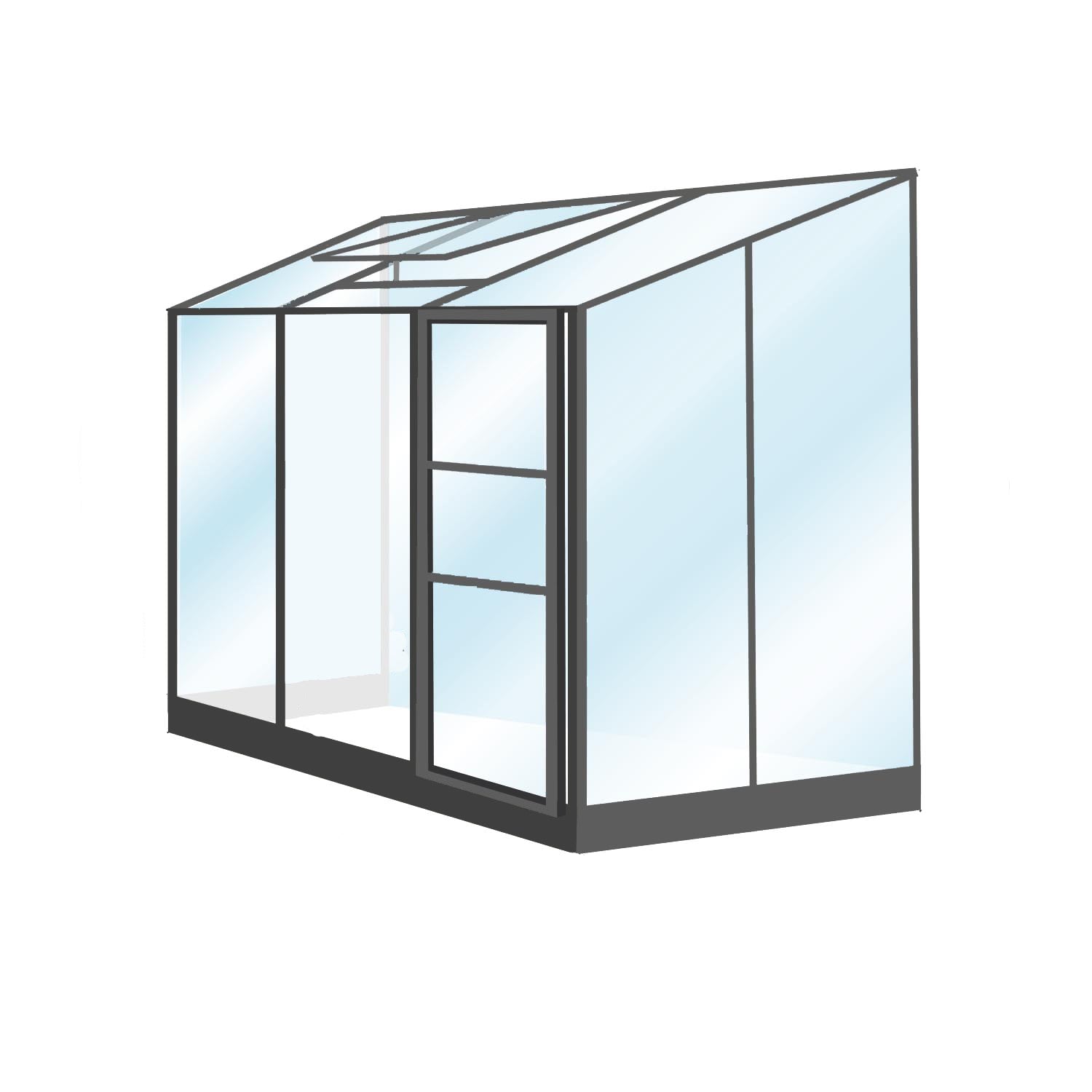 De kas is gemaakt van stevige aluminiumprofielen en veiligheidsglas, met een schuifdeur en dakvenster voor natuurlijke ventilatie. Het funderingsframe en de hemelwaterafvoer maken de set compleet. Een toegankelijke, duurzame kas die jarenlang meegroeit met je tuin.