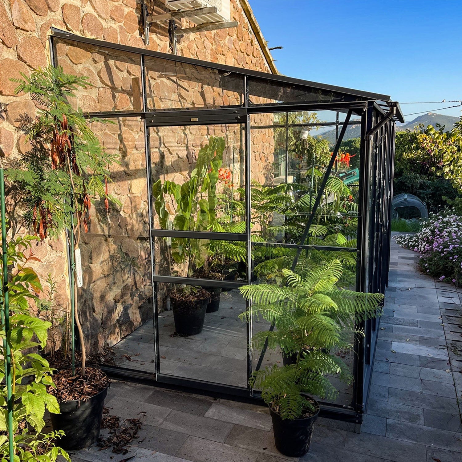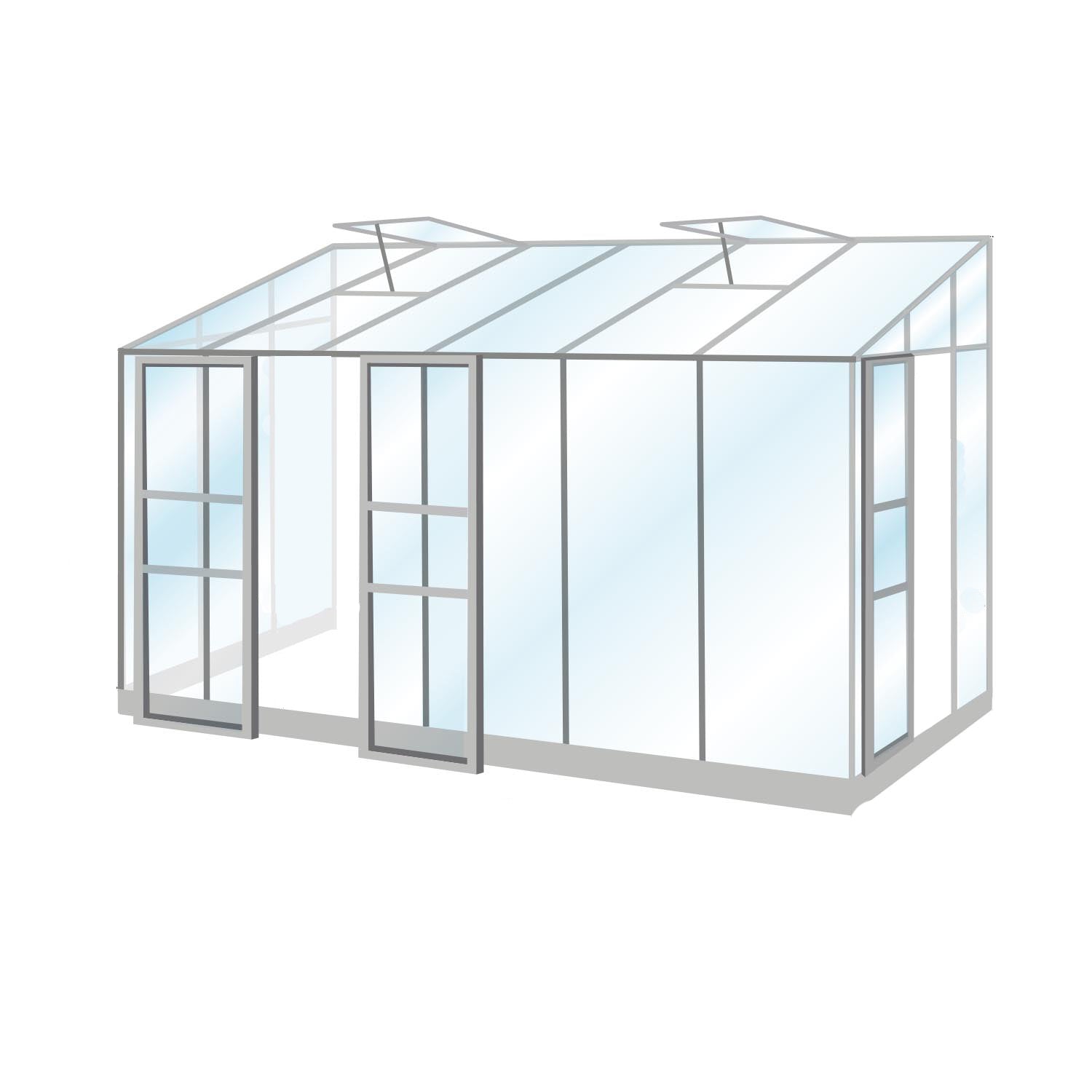 De aluminiumconstructie met veiligheidsglas is duurzaam, stevig en helder. Deze kas heeft 2 schuifdeuren. De dubbele schuifdeur is de grote ingang aan de voorzijde, deze kan zowel rechts, links als centraal geïnstalleerd worden. De kleinere enkele schuifdeur is een extra toegang aan de zijkant. Ook deze deur kan zowel links als rechts gemonteerd worden. De schuifdeur geeft gemakkelijke toegang en het funderingsframe zorgt voor een stabiele basis. De hemelwaterafvoer is standaard inbegrepen, zodat de kas direct compleet is. Een duurzame investering voor jaren vol tuinplezier.
