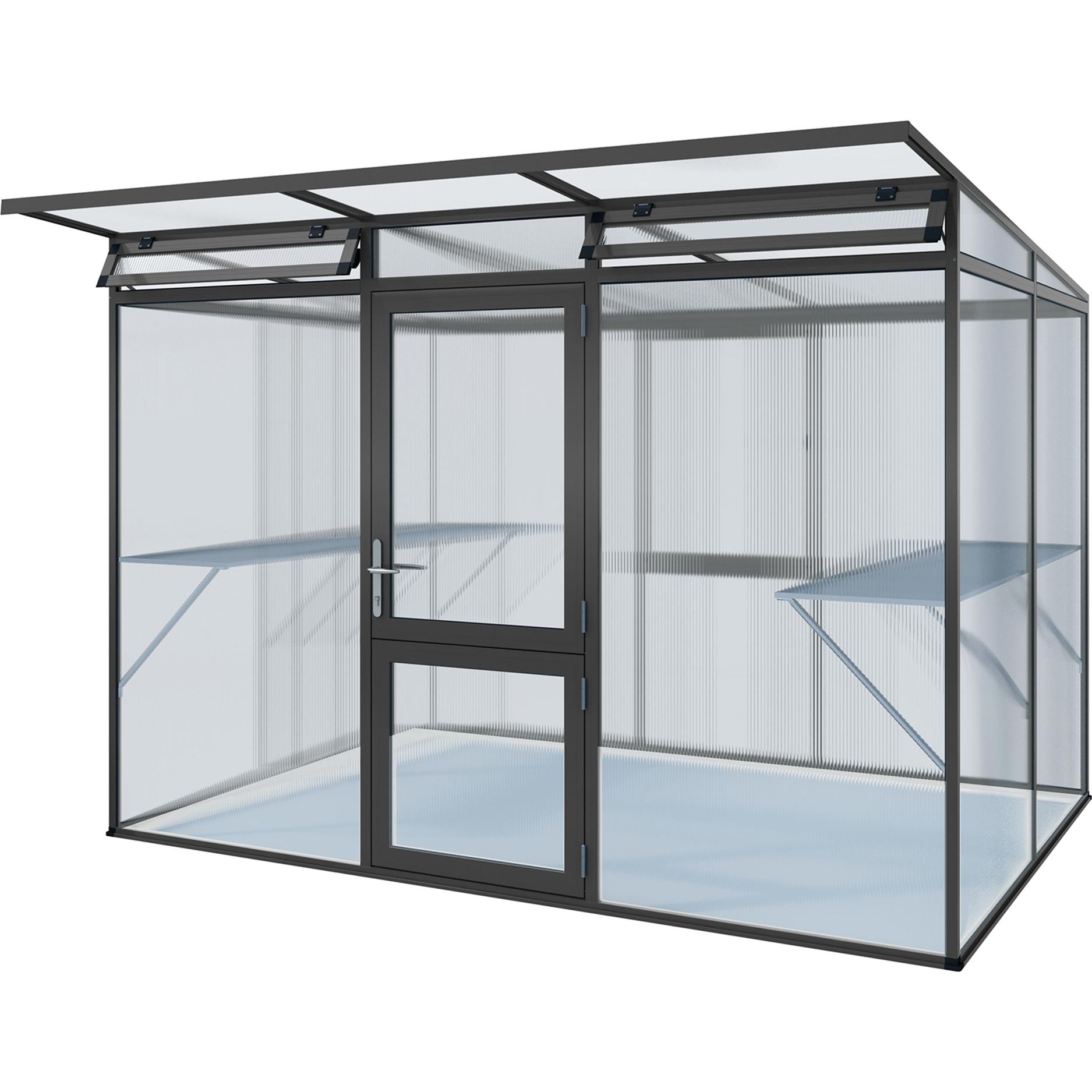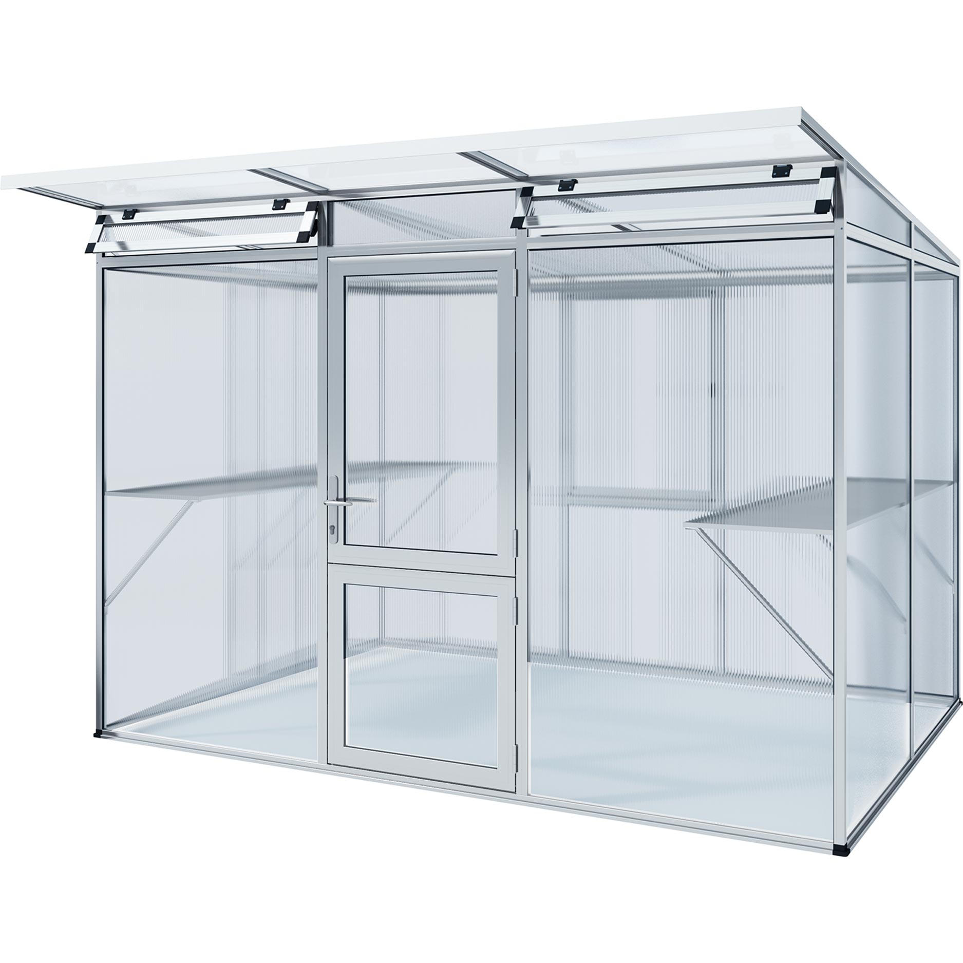 De aluminiumconstructie is licht, stabiel en onderhoudsarm. De beglazing bestaat uit 10 mm kanaalplaten die warmte uitstekend vasthouden en UV-beschermd zijn. Hierdoor blijven de temperatuur en lichtverdeling gelijkmatig, wat de groei en weerstand van planten bevordert. De kas beschikt over een brede draaideur, een automatisch dakraam voor ventilatie en geïntegreerde regengoten voor waterafvoer of -opvang. Het optionele funderingsframe garandeert een stabiele plaatsing en extra duurzaamheid, zelfs bij langdurig gebruik.