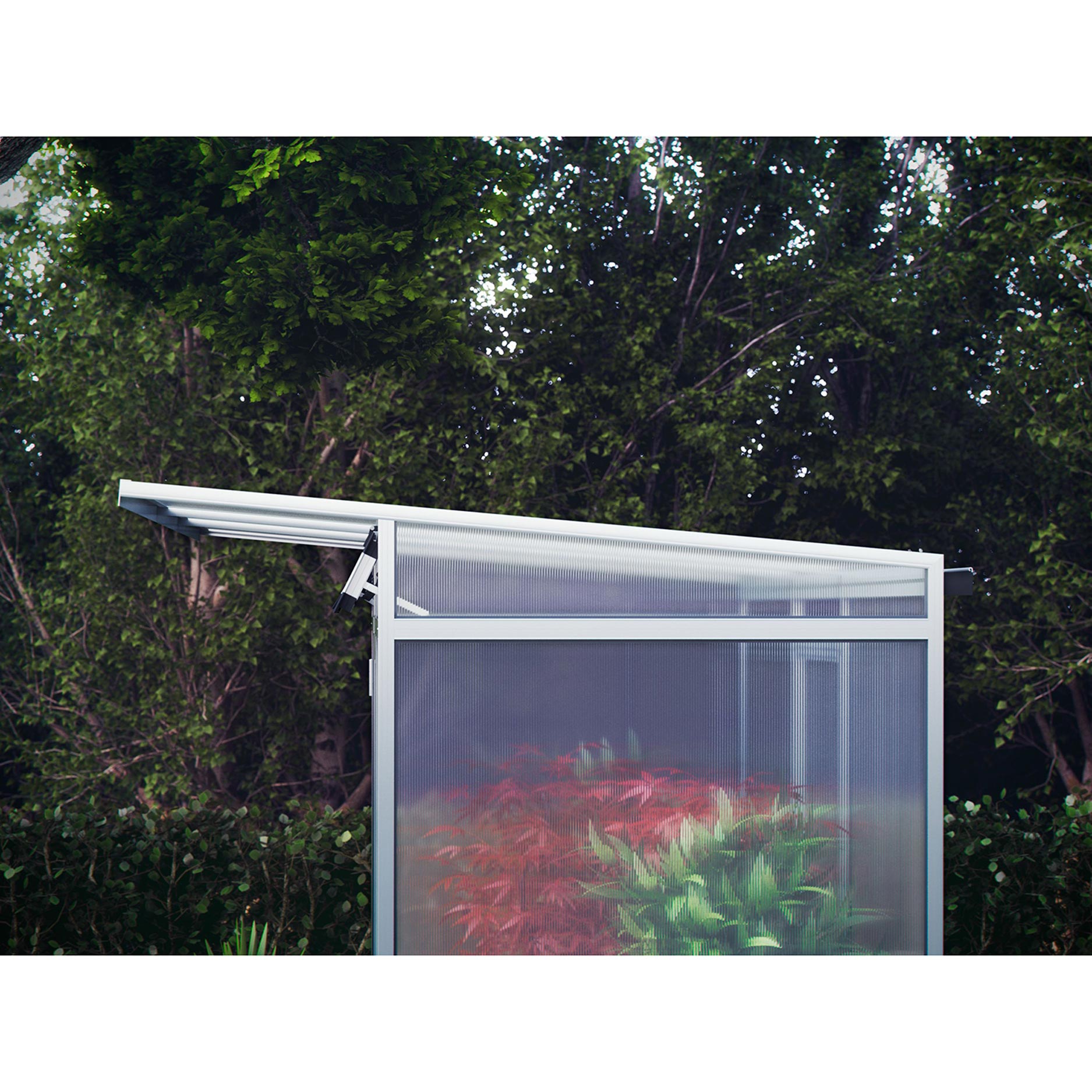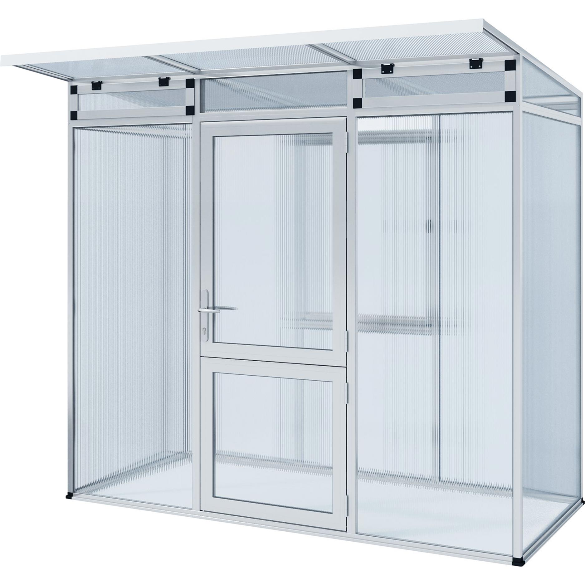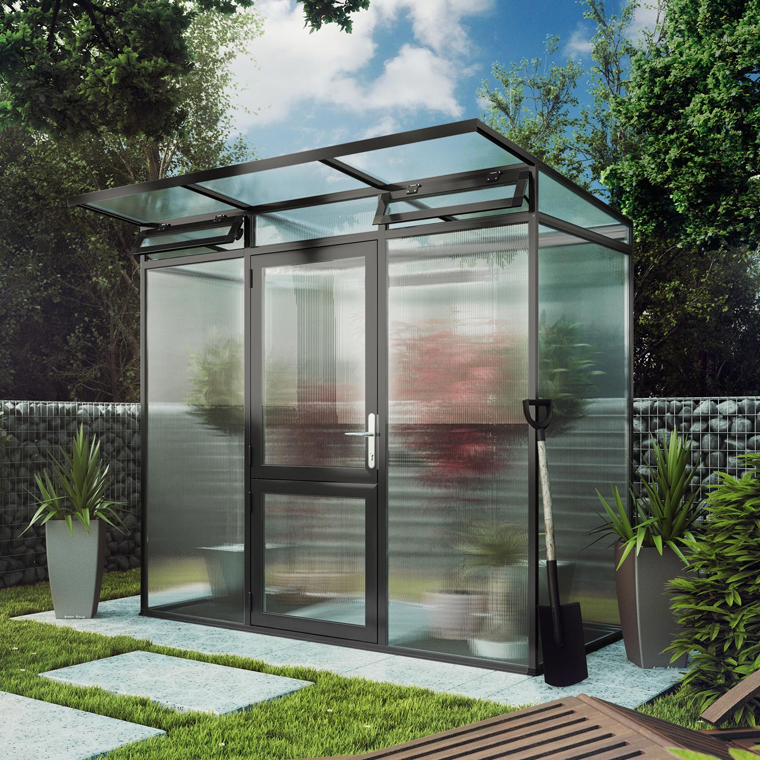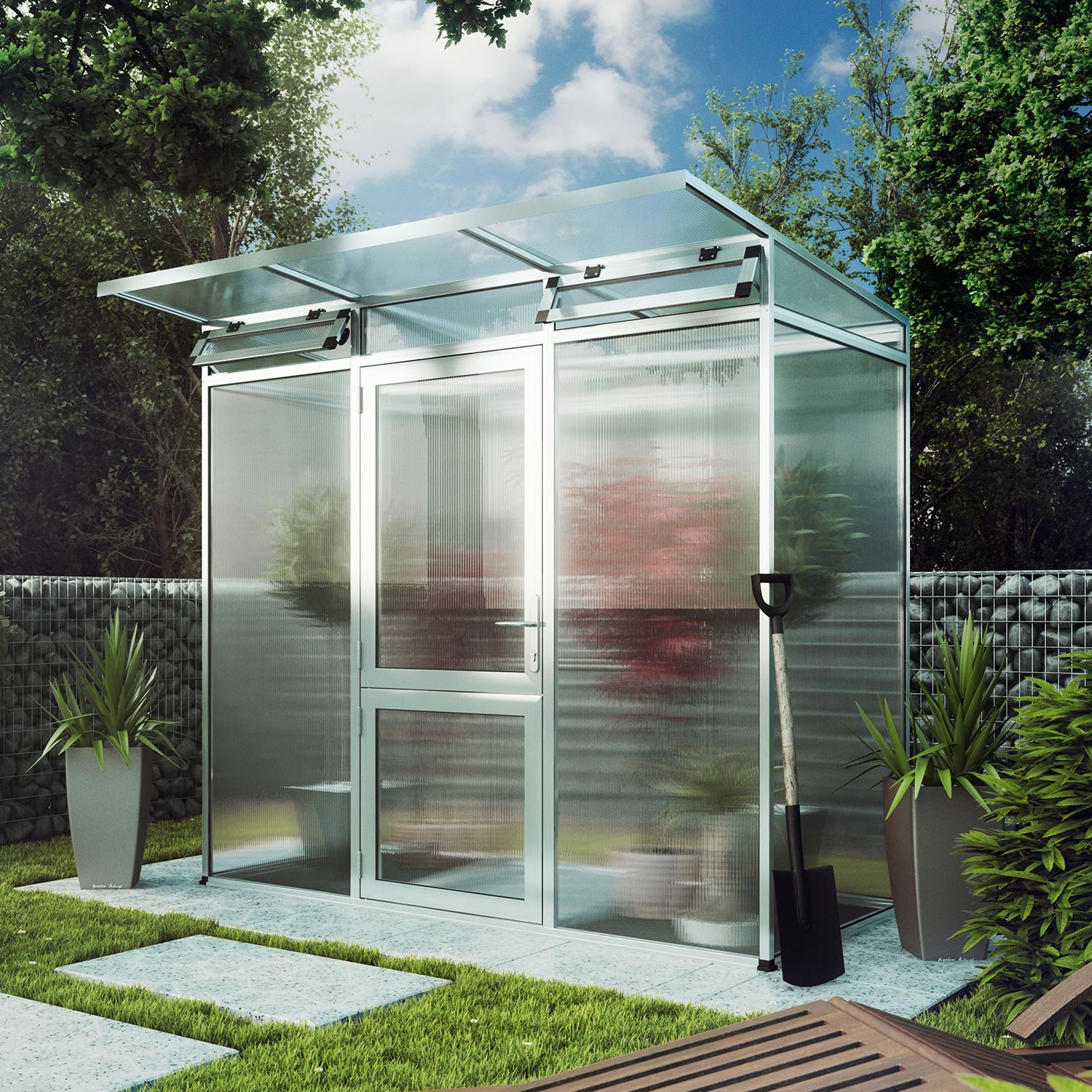 De constructie bestaat uit een sterke aluminium basis met 10 mm kanaalplaten die zowel isolerend als UV-beschermd zijn. Dit zorgt voor een stabiel binnenklimaat, minder condensvorming en optimale lichtverdeling. De kas is voorzien van een grote draaideur, een dakraam met automatische opener en geïntegreerde regengoten aan beide zijden. Door het lage energieverlies is de Linea I geschikt voor gebruik in het vroege voorjaar en tot laat in het najaar. Met het optionele funderingsframe staat de kas stabiel en waterpas, ook op ongelijke ondergrond.