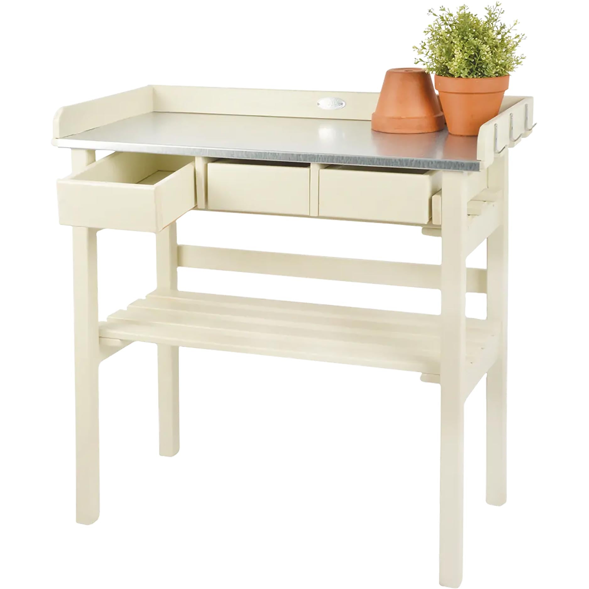 De Esschert Design Oppottafel Wit is een praktische en sfeervolle werkplek voor iedereen die graag in de tuin bezig is. Of je nu zaait, verpot, stekt of gereedschap wilt organiseren: deze tuinwerktafel geeft je een vaste plek om comfortabel te werken op prettige hoogte. Dankzij het robuuste ontwerp met zinken werkblad, drie lades en extra opbergruimte heb je alles overzichtelijk bij de hand, waardoor tuinieren rustiger en efficiënter wordt.