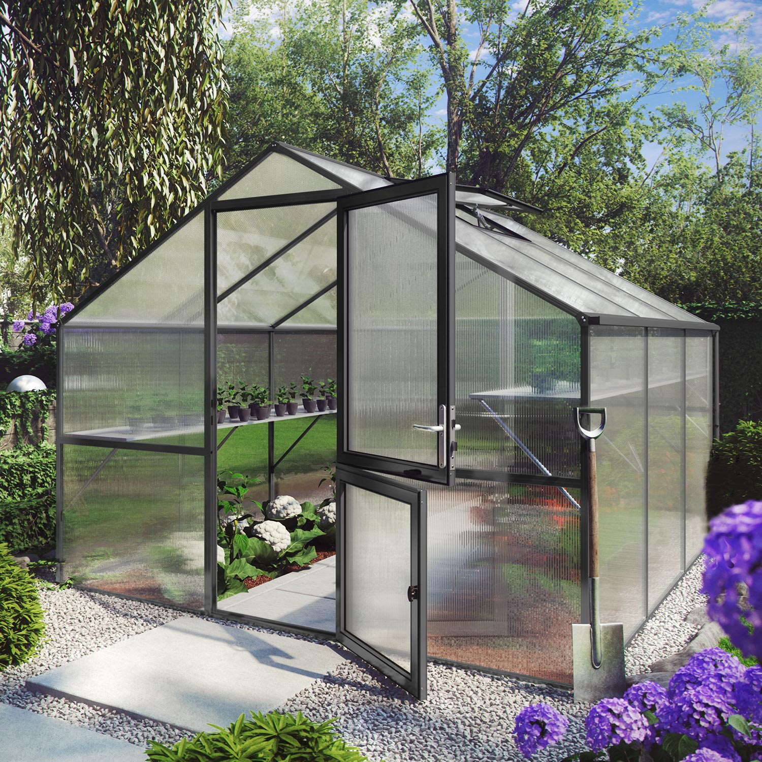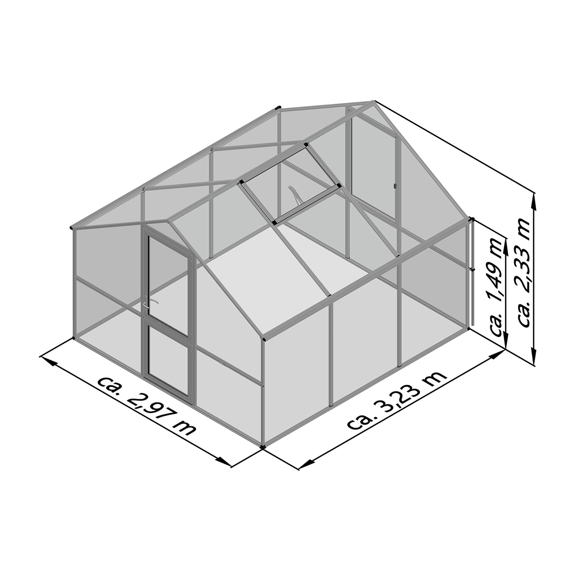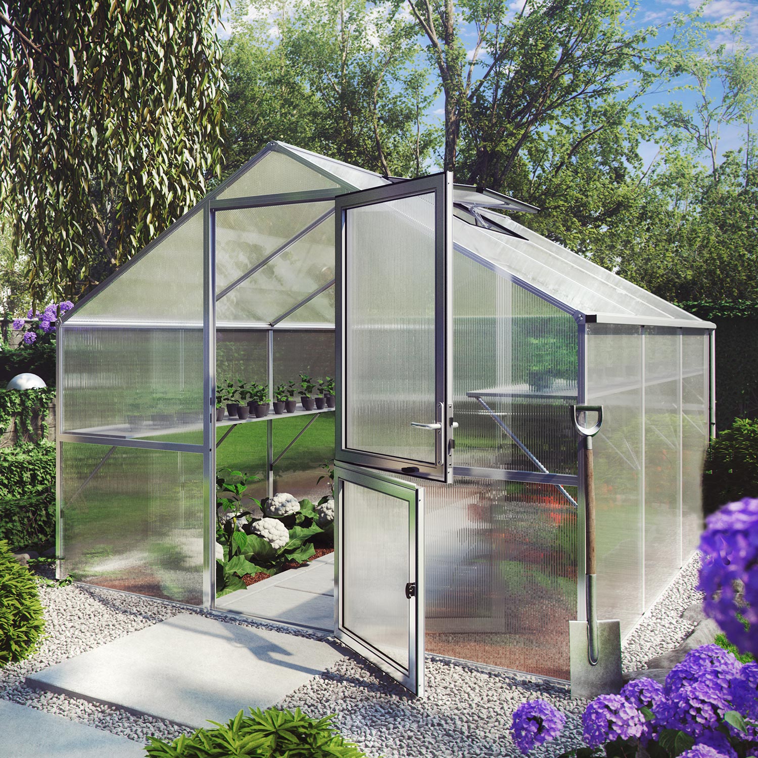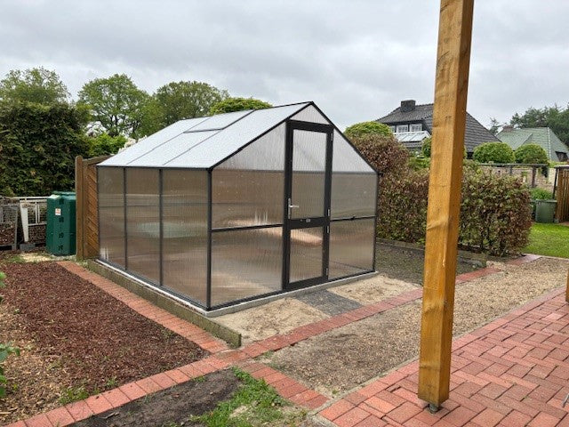 De aluminiumconstructie is zeer stevig en onderhoudsarm, bestand tegen intensief gebruik en alle weersinvloeden. De 10 mm kanaalplaten zorgen voor een uitstekende isolatie en lichtdiffusie, waardoor planten beschermd zijn tegen felle zon en warmteverlies beperkt blijft. Dit resulteert in een stabiel groeiklimaat en hoge opbrengst. De kas is standaard uitgerust met een brede draaideur, een automatisch dakraam en een handmatig achterraam voor optimale ventilatie. Regengoten aan beide zijden voeren water efficiënt af en kunnen worden aangesloten op een regenton. Het optionele funderingsframe biedt extra stabiliteit en een perfecte pasvorm op iedere ondergrond.