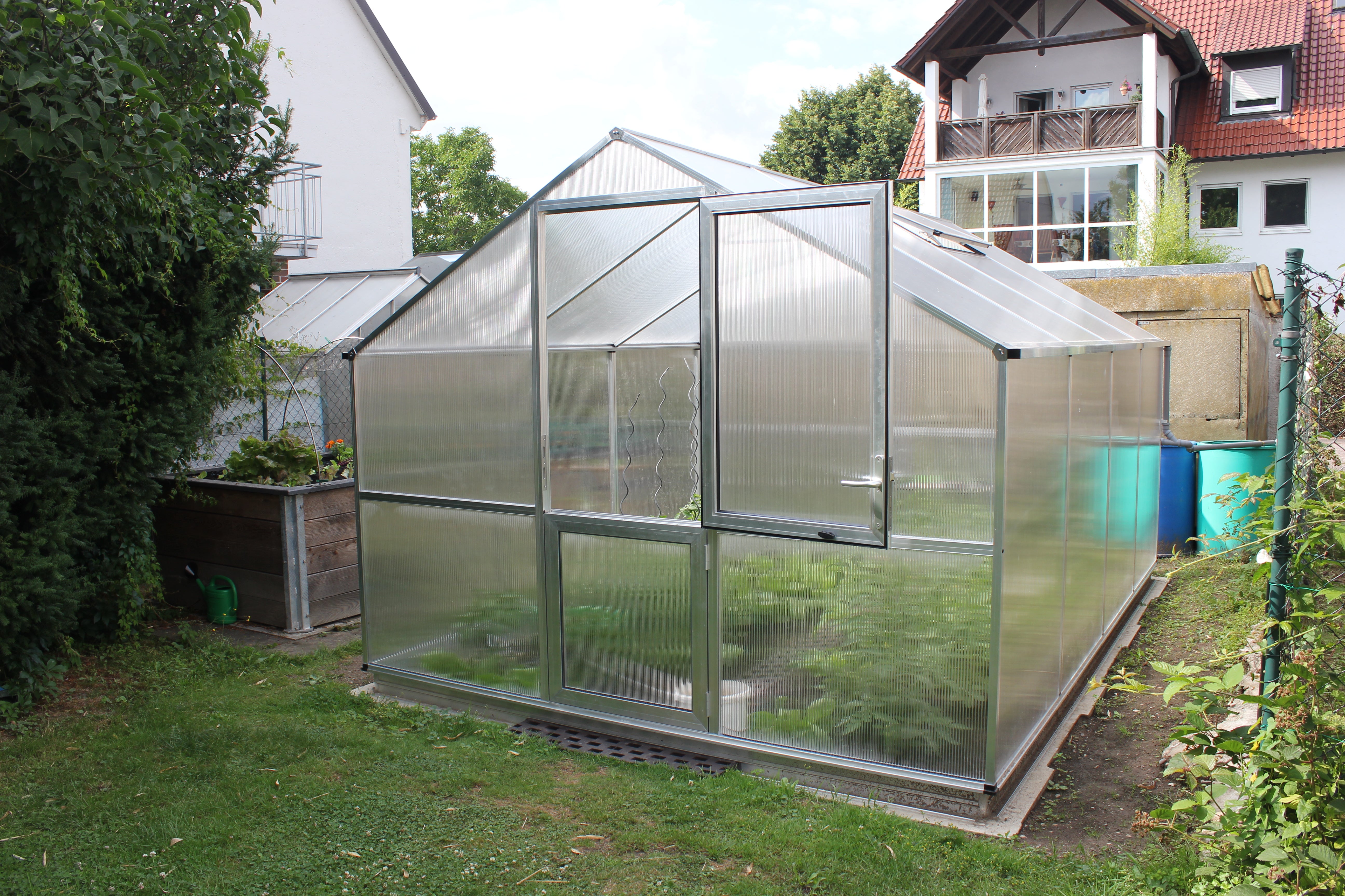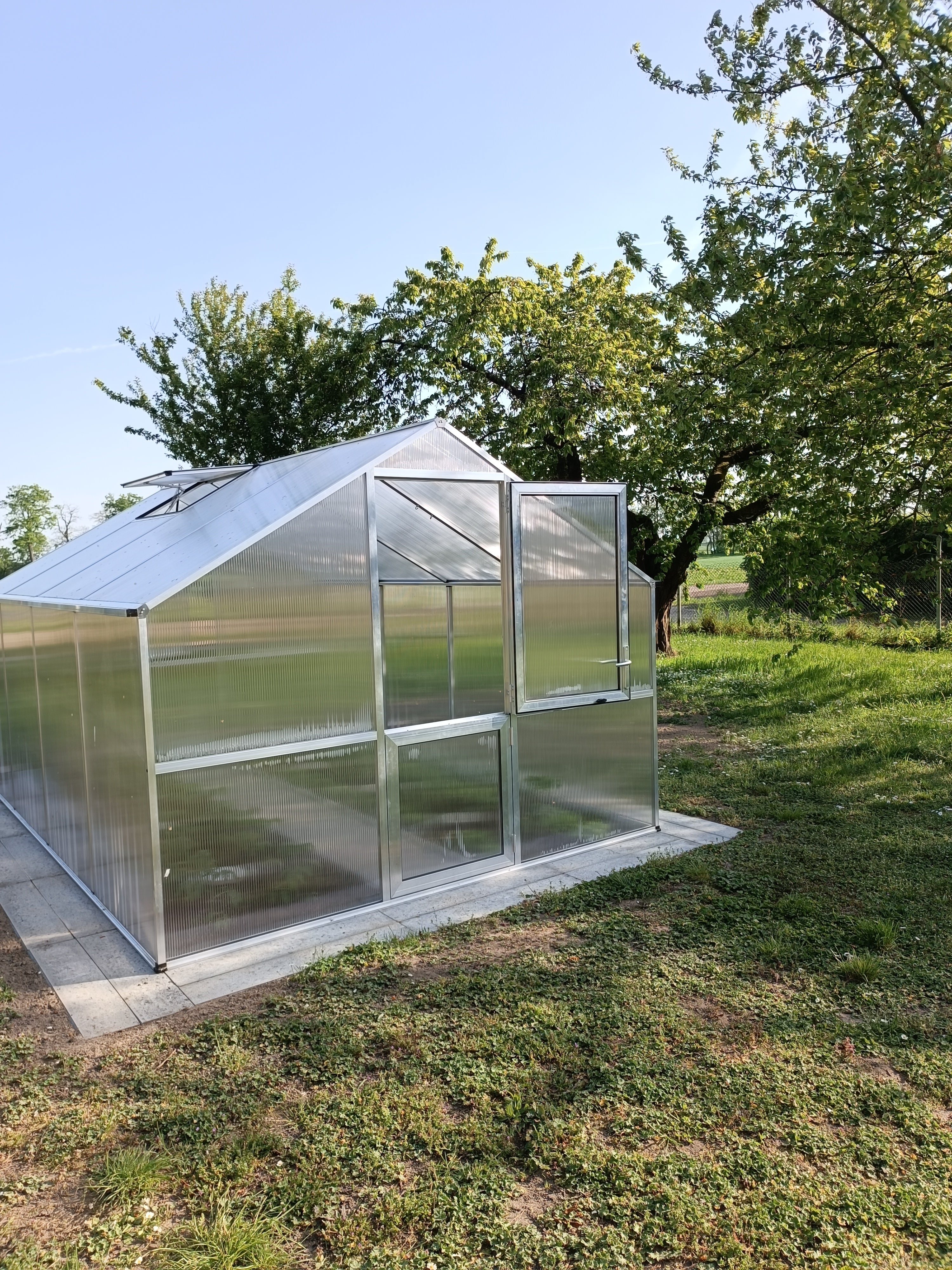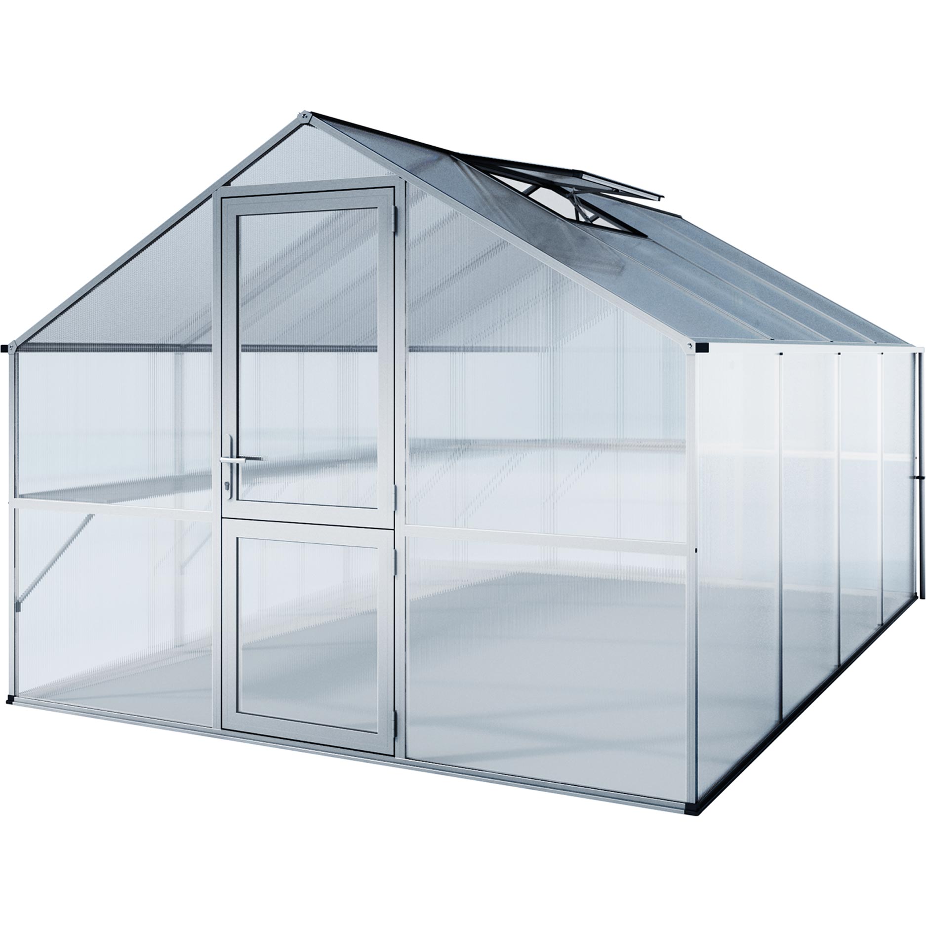 Het aluminium frame garandeert maximale stabiliteit en lange levensduur. De beglazing bestaat uit 10 mm kanaalplaten, die zorgen voor uitstekende isolatie, lichtverspreiding en bescherming tegen UV-straling. Hierdoor blijft de temperatuur gelijkmatig, ook bij sterk wisselende weersomstandigheden. De kas is uitgerust met een brede draaideur, een automatisch dakraam en een handmatig achterraam voor gecontroleerde ventilatie. De dubbele regengoten met afvoer aan beide zijden maken het opvangen van regenwater eenvoudig. Met het optionele funderingsframe staat de kas rotsvast, zelfs bij harde wind.