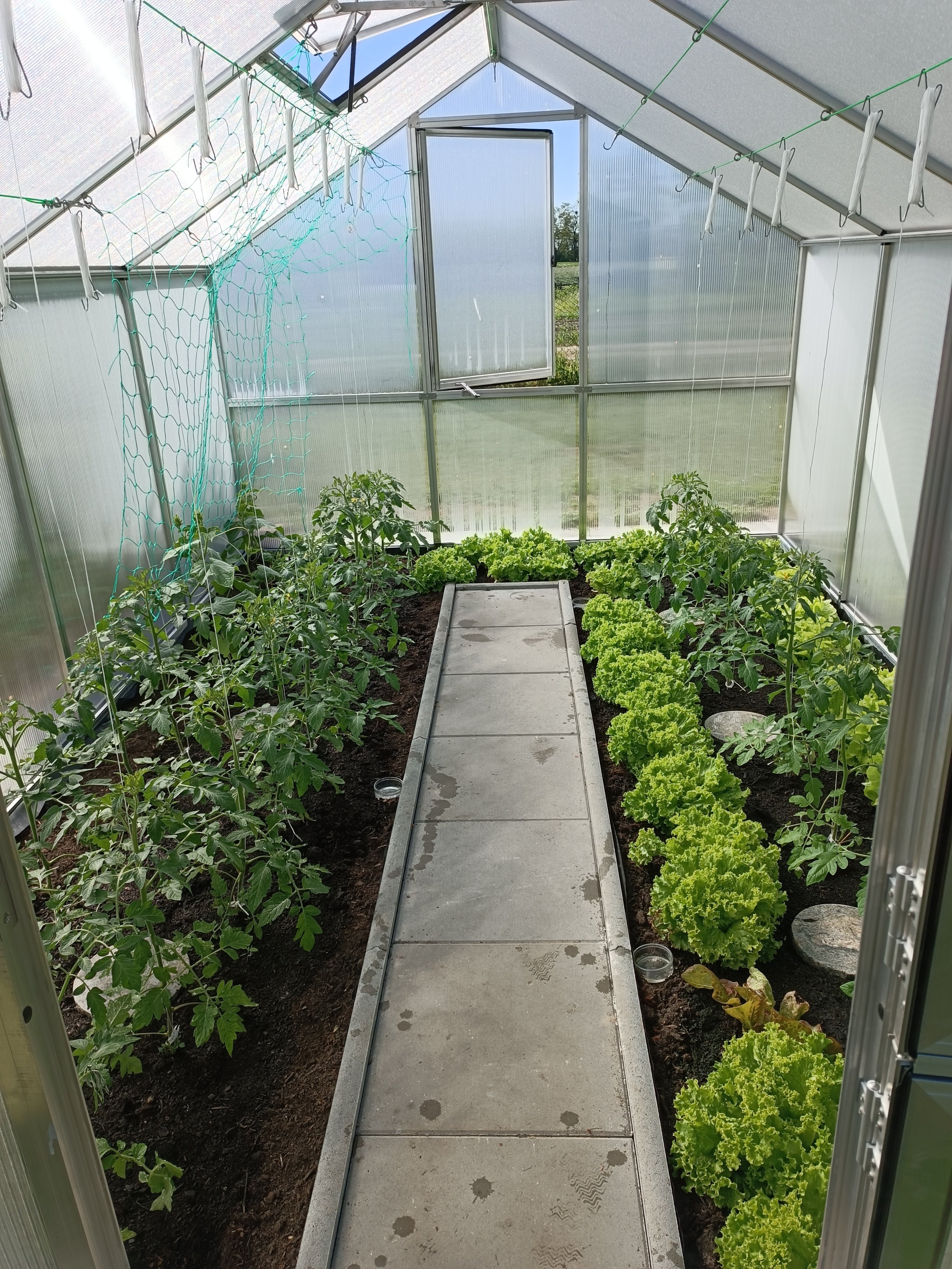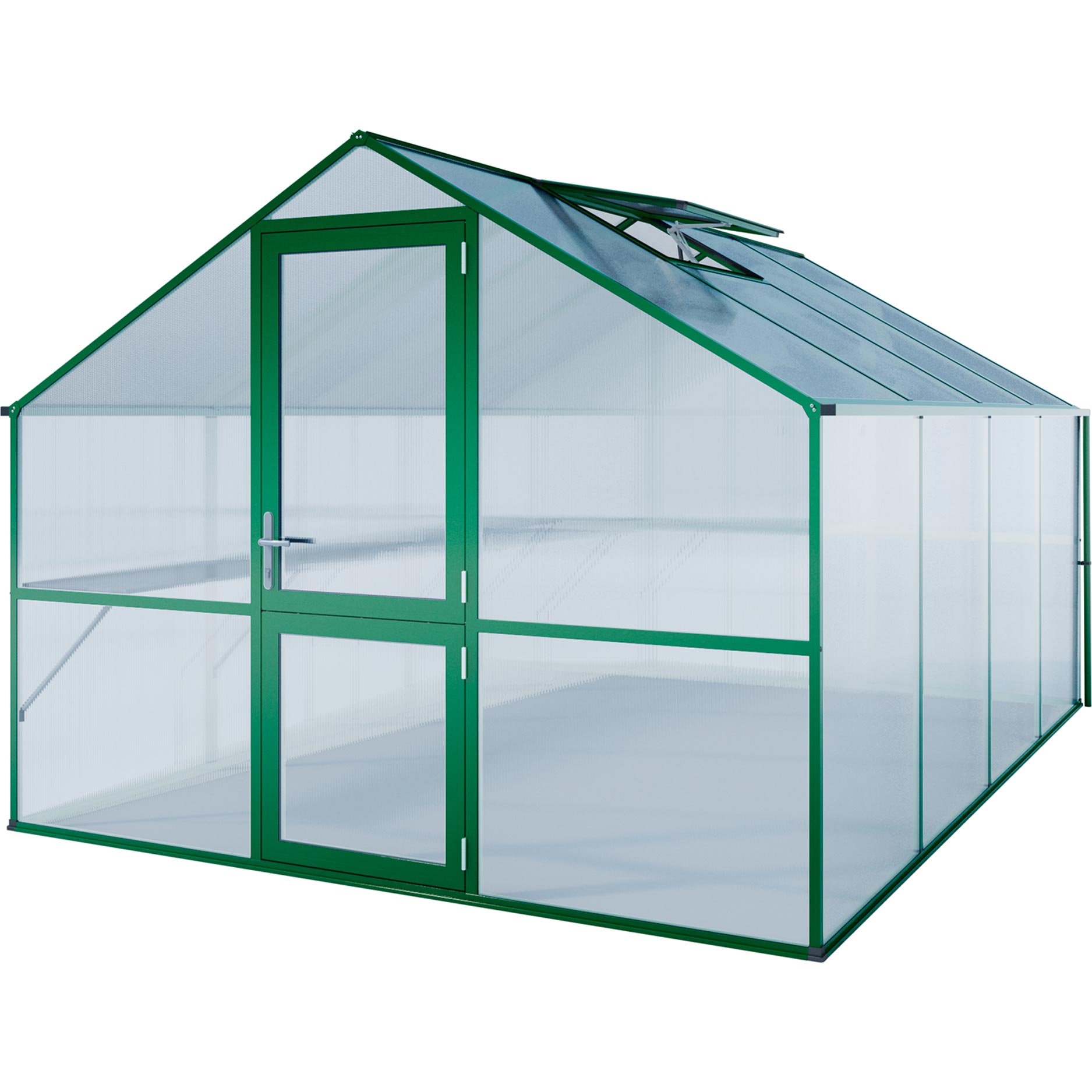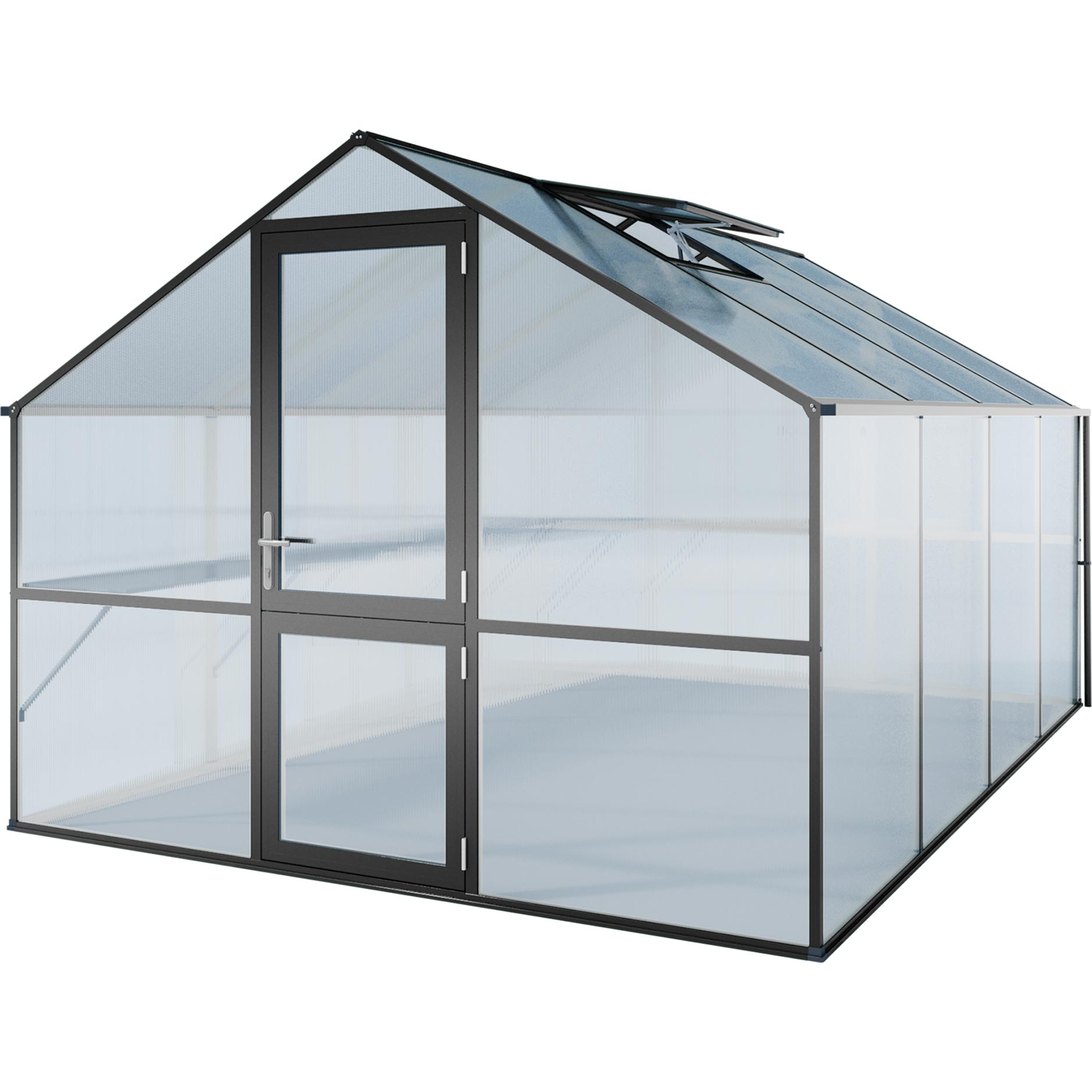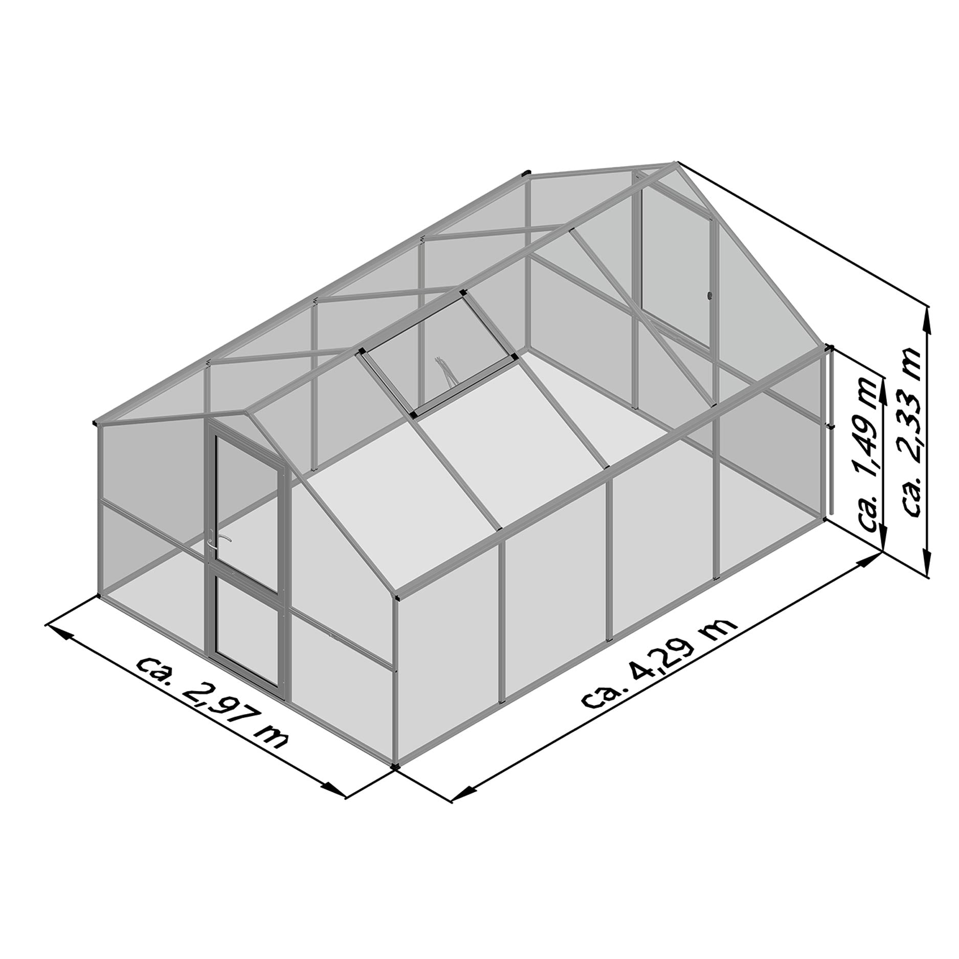 Het aluminium frame garandeert maximale stabiliteit en lange levensduur. De beglazing bestaat uit 10 mm kanaalplaten, die zorgen voor uitstekende isolatie, lichtverspreiding en bescherming tegen UV-straling. Hierdoor blijft de temperatuur gelijkmatig, ook bij sterk wisselende weersomstandigheden. De kas is uitgerust met een brede draaideur, een automatisch dakraam en een handmatig achterraam voor gecontroleerde ventilatie. De dubbele regengoten met afvoer aan beide zijden maken het opvangen van regenwater eenvoudig. Met het optionele funderingsframe staat de kas rotsvast, zelfs bij harde wind.