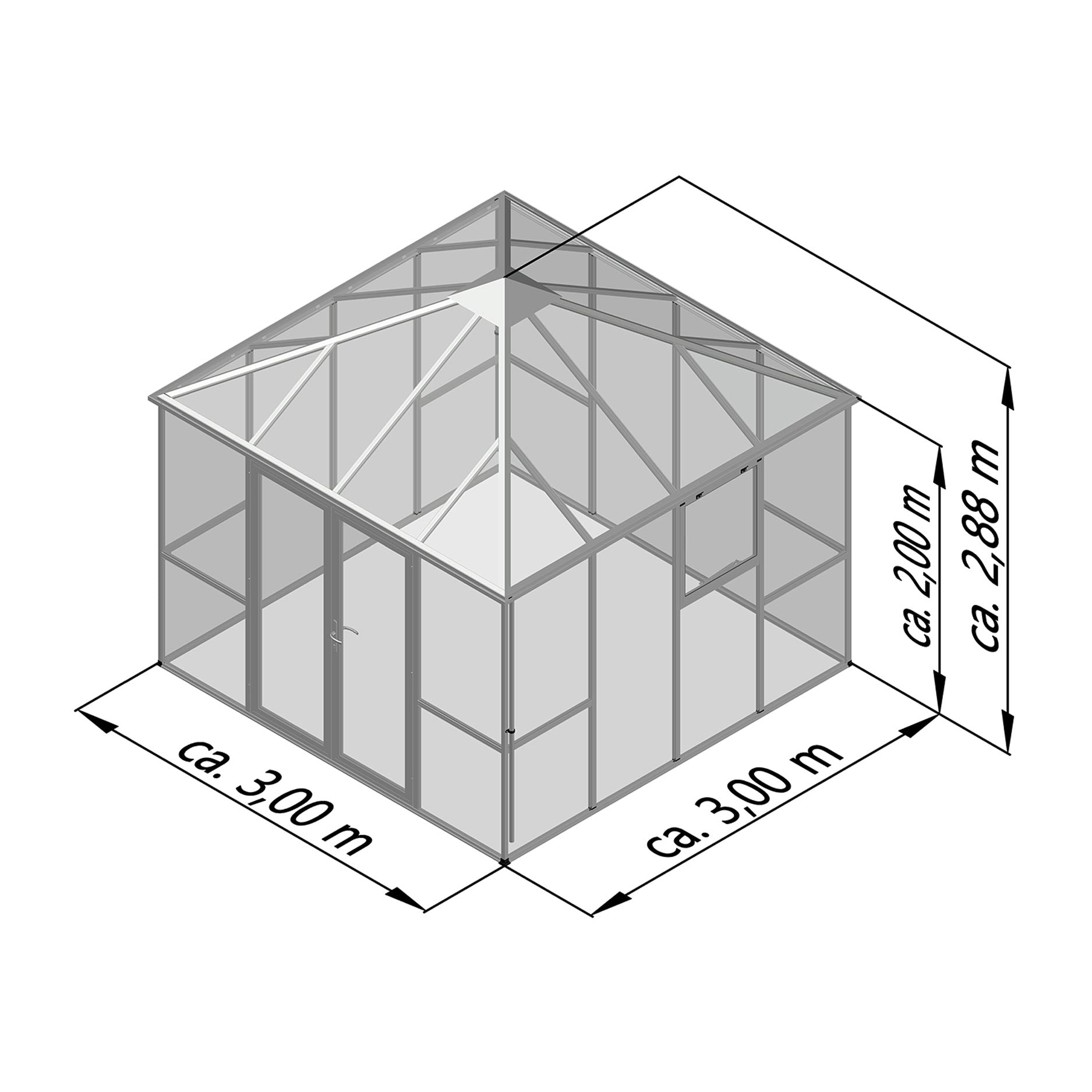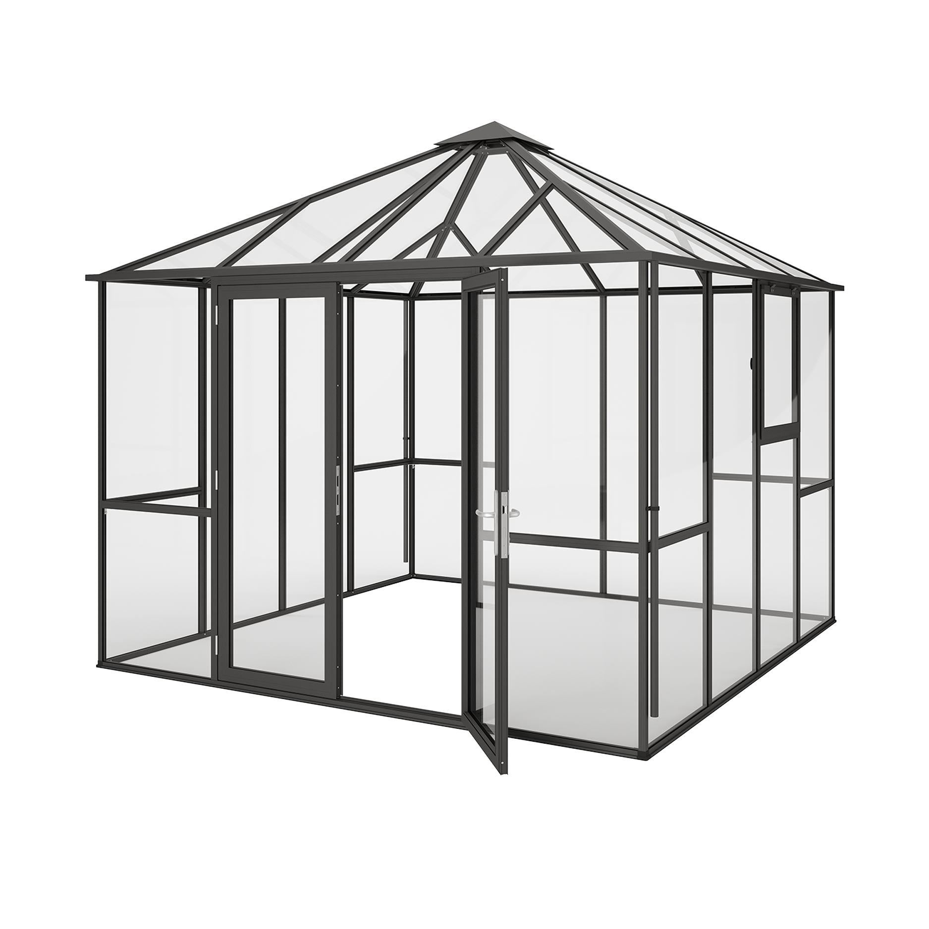De constructie bestaat uit gepoedercoat aluminium in antracietgrijs, met 4mm veiligheidsglas in de wanden en 10mm kanaalplaten in het dak. Deze combinatie biedt helder zicht, uitstekende isolatie en bescherming tegen hitte. De kas heeft een zijhoogte van 2.00m, wat zorgt voor ruimtelijk comfort. Per zijde kan gekozen worden voor een dubbele deur of twee zijramen, afhankelijk van gebruik en voorkeur. Het ontwerp is zowel technisch verfijnd als esthetisch uitgebalanceerd, waardoor de PaviLux I een echte blikvanger is in de tuin.