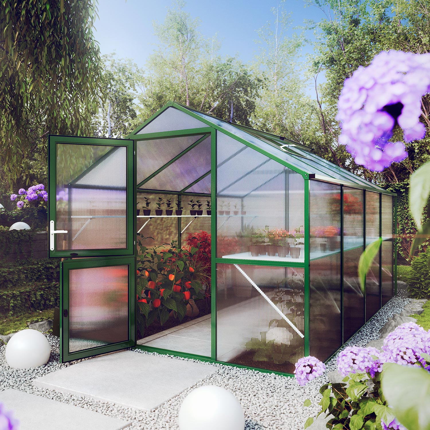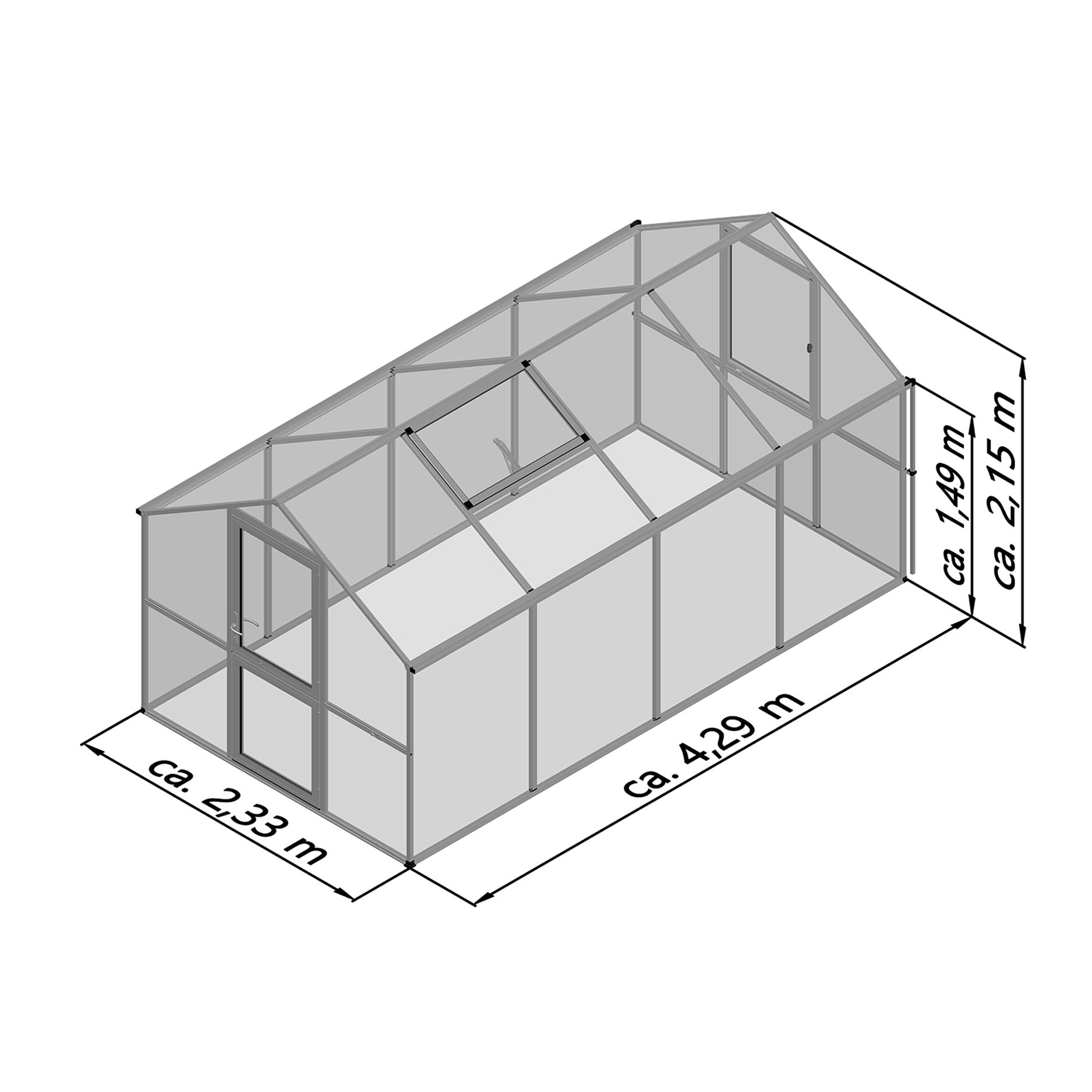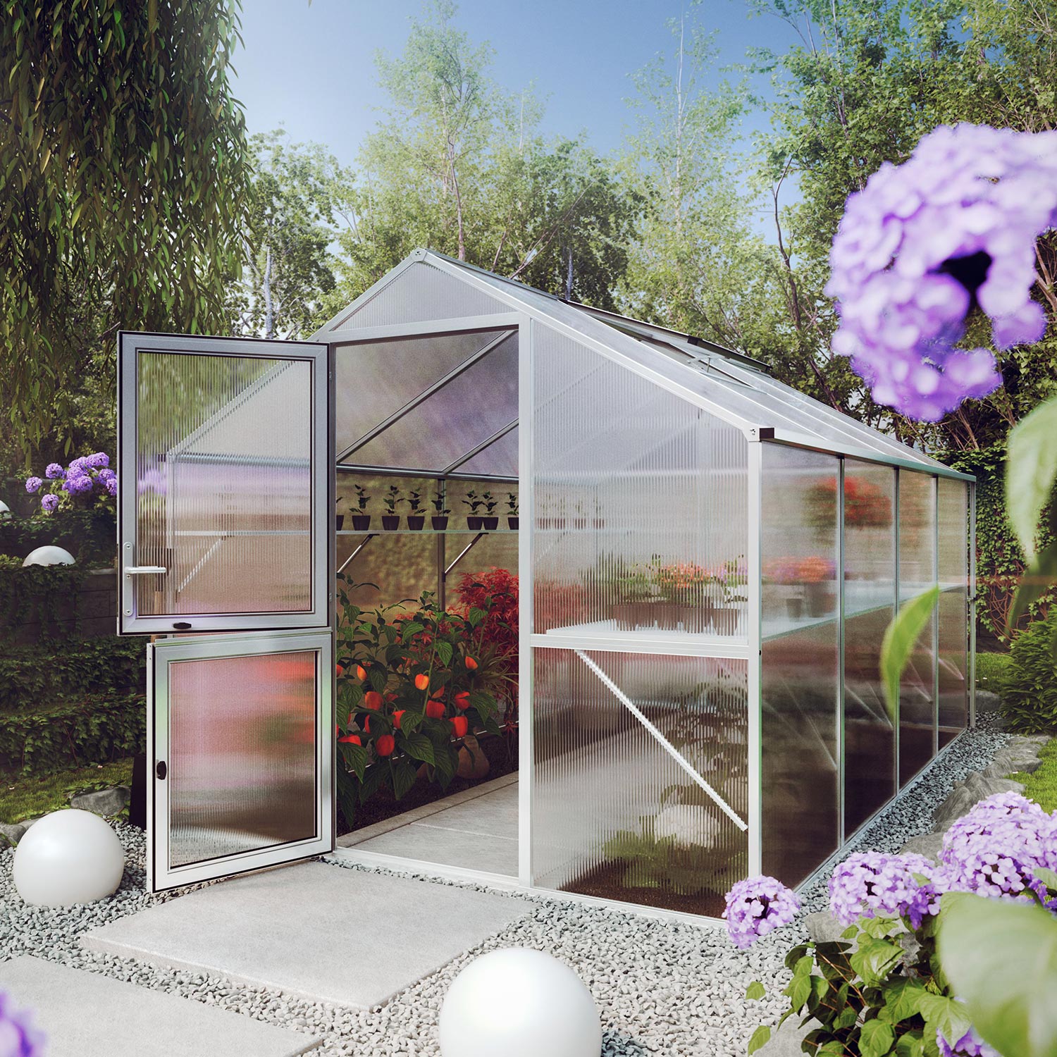 Het aluminium frame is duurzaam en onderhoudsarm, ontworpen om jaar in jaar uit bestand te zijn tegen wind en neerslag. De beglazing uit 10mm kanaalplaten biedt topklasse isolatie, waardoor de kas warmte vasthoudt en condensvorming beperkt blijft. Dit maakt de Rose IV uitermate geschikt voor gebruik in alle seizoenen. De draaideur geeft ruime toegang en het dakraam regelt ventilatie op warme dagen. De geïntegreerde regengoten voeren water efficiënt af, en het optionele funderingsframe geeft extra stabiliteit en levensduur.