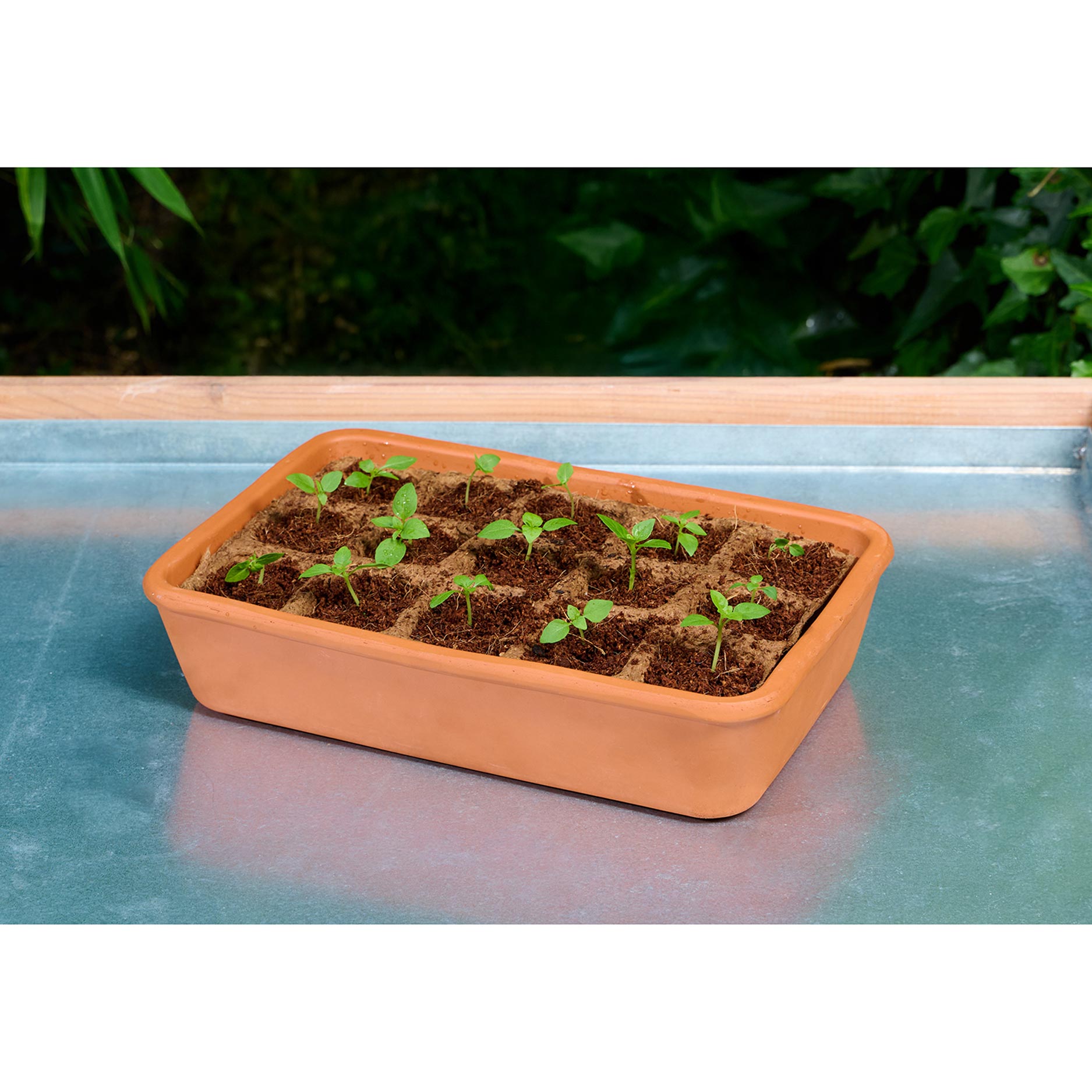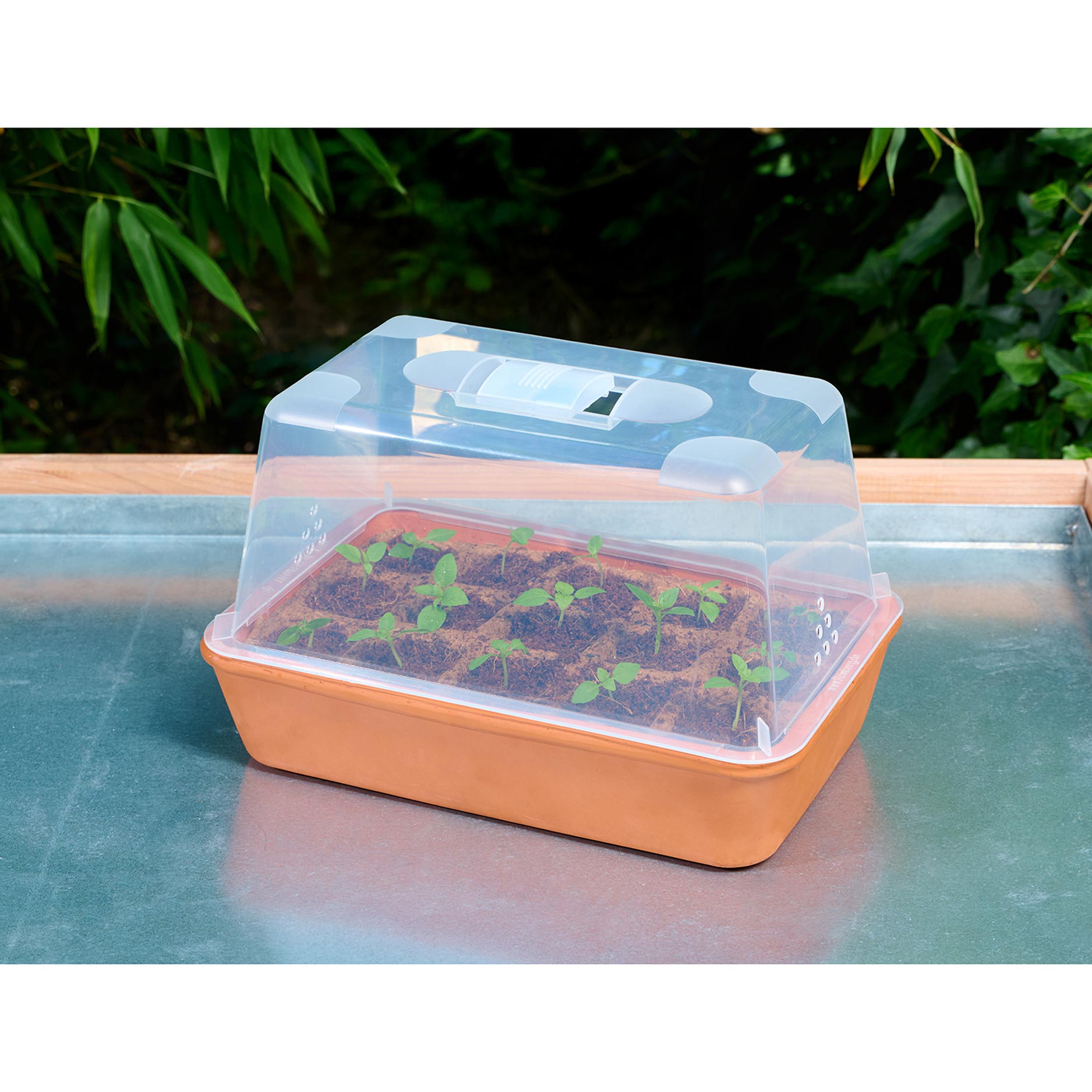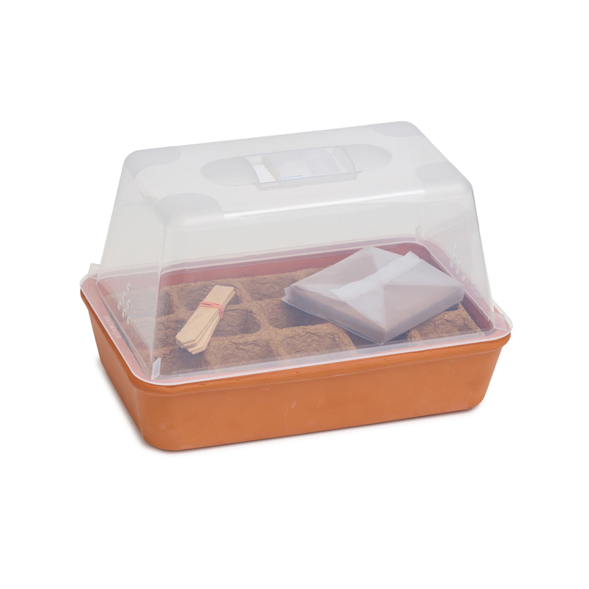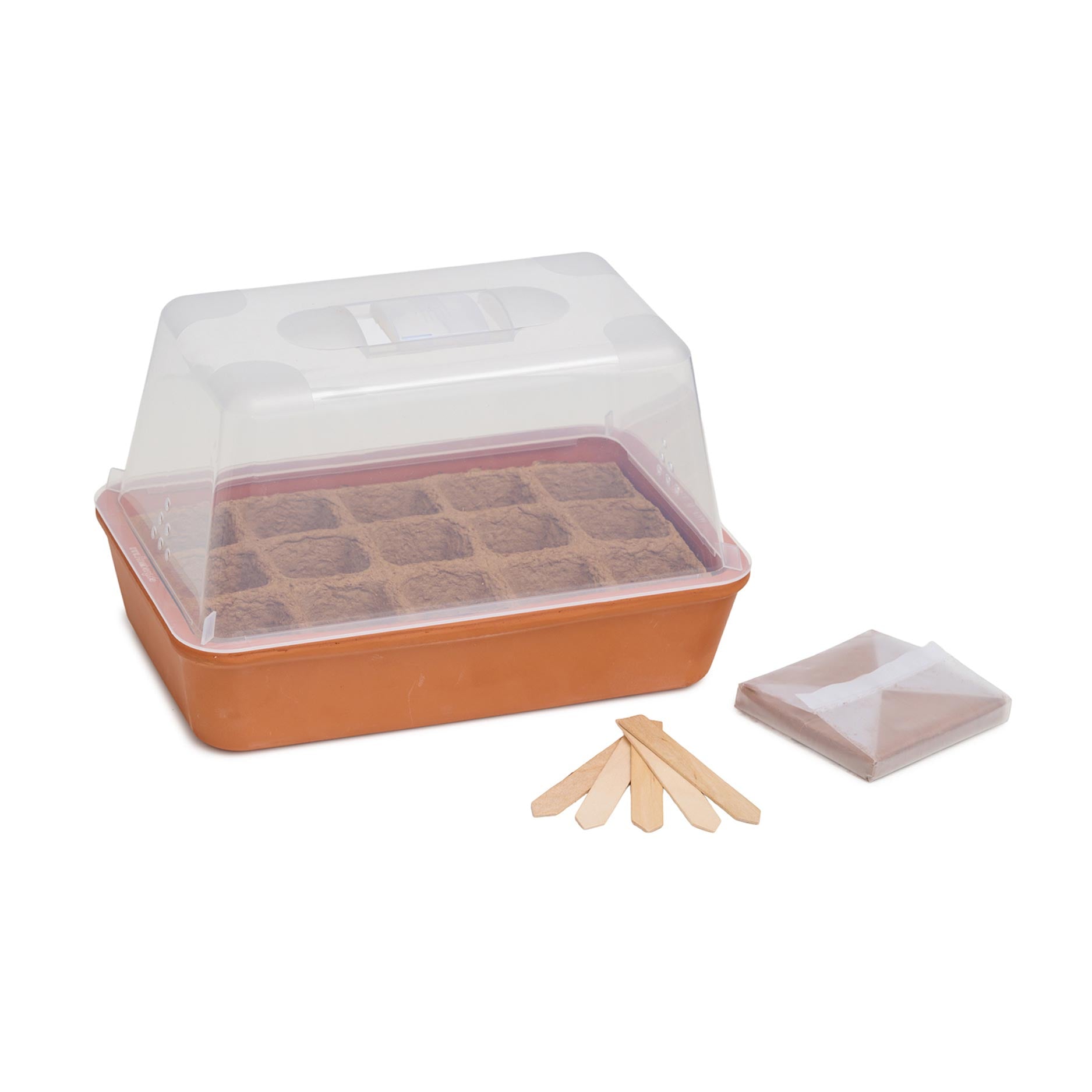 De Kweekset Terracotta is een compact mini‑kasje van echte terracotta. De set bevat een schotel, transparante kap met ventilatie, 15 biologisch afbreekbare potjes, turfvrije kokos‑aarde en houten etiketten, ideaal om groenten, kruiden of bloemen van zaad op te kweken.