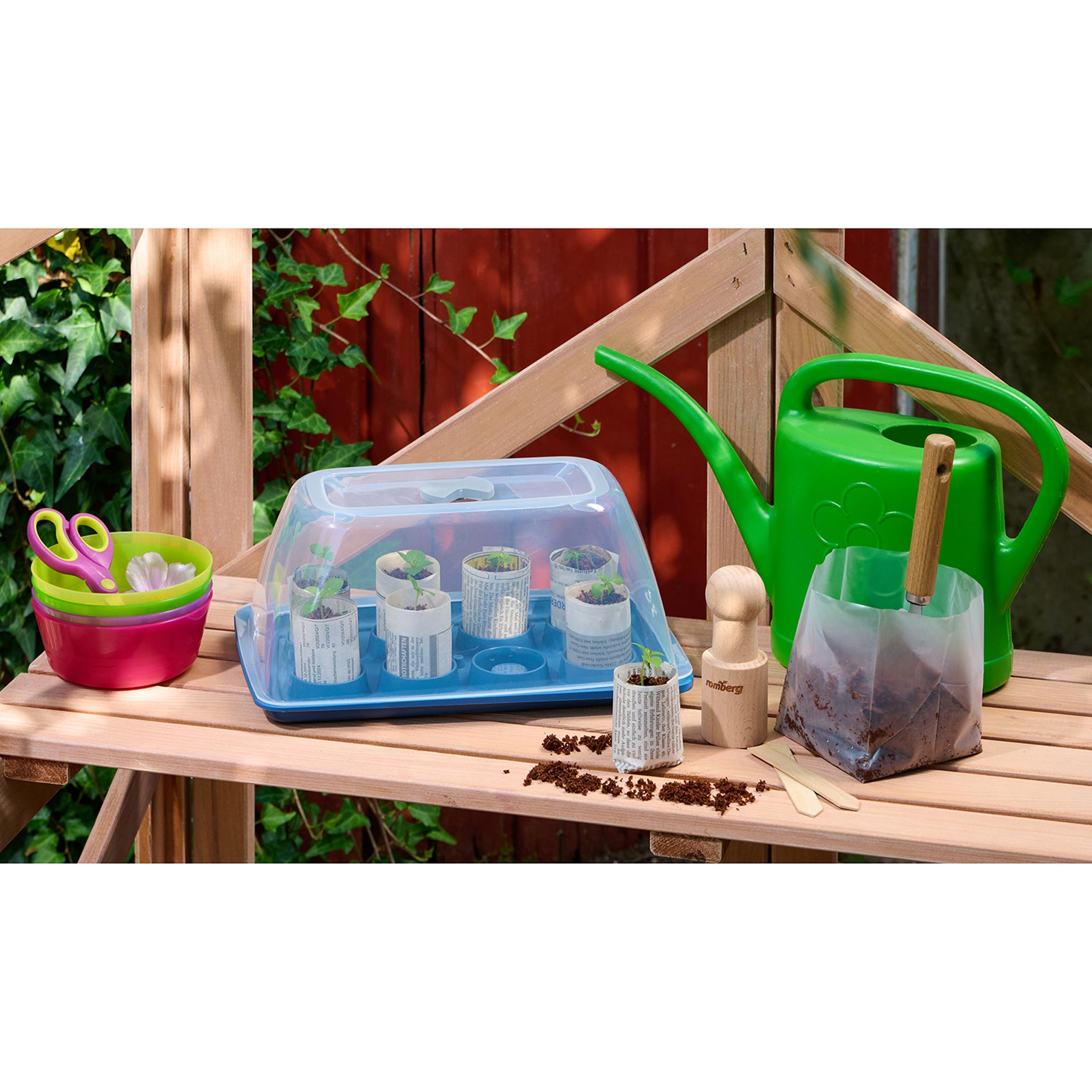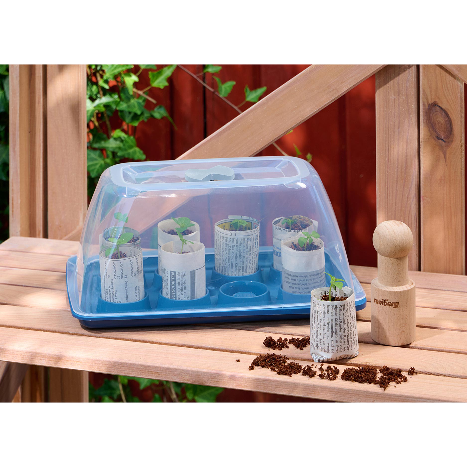 Het gebruik is eenvoudig: met de houten pers vorm je eerst kleine potjes van oud krantenpapier. Daarna laat je de kokosgrond opzwellen met water, vult de potjes en zaait jouw favoriete groente-, kruiden- of bloemzaden. De potjes plaats je in de onderschaal en sluit je af met de transparante kap, die zorgt voor een warm en vochtig microklimaat waarin zaden snel kiemen. Regelmatig ventileren en licht vochtig houden is voldoende om de jonge planten sterk te laten groeien.